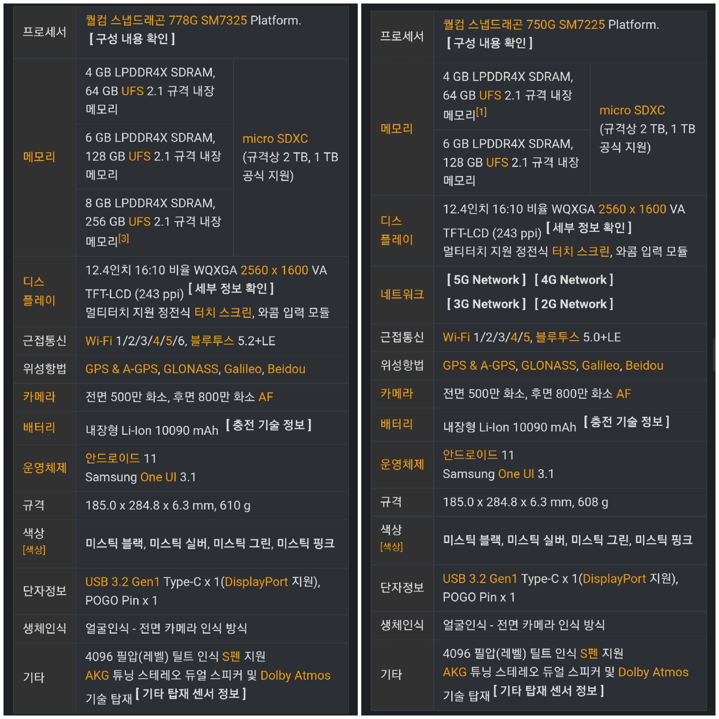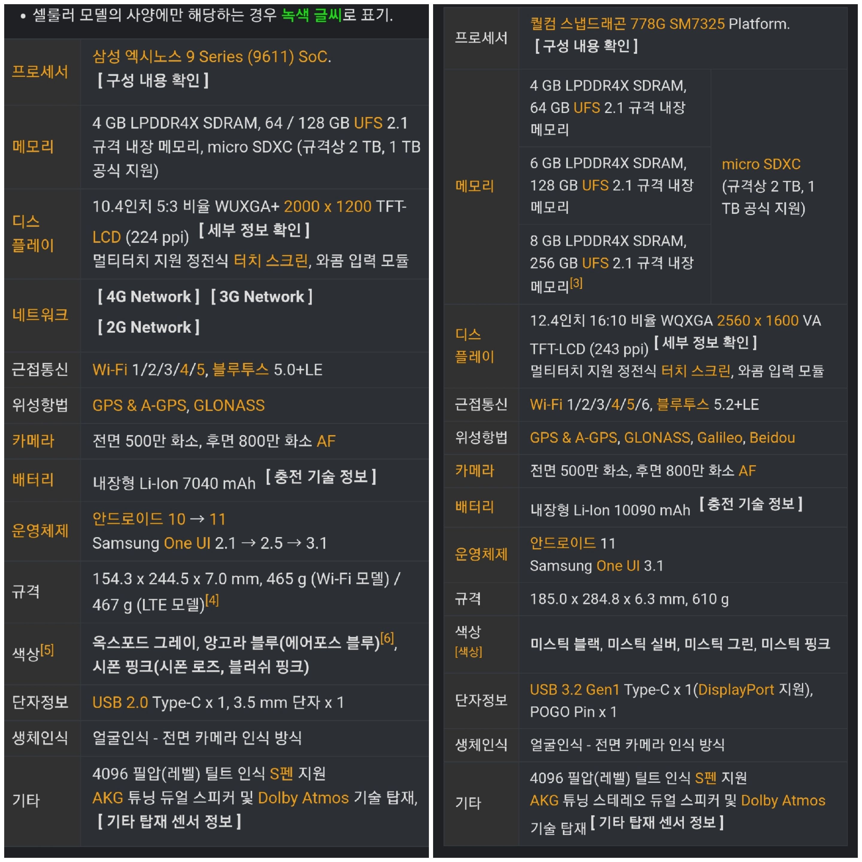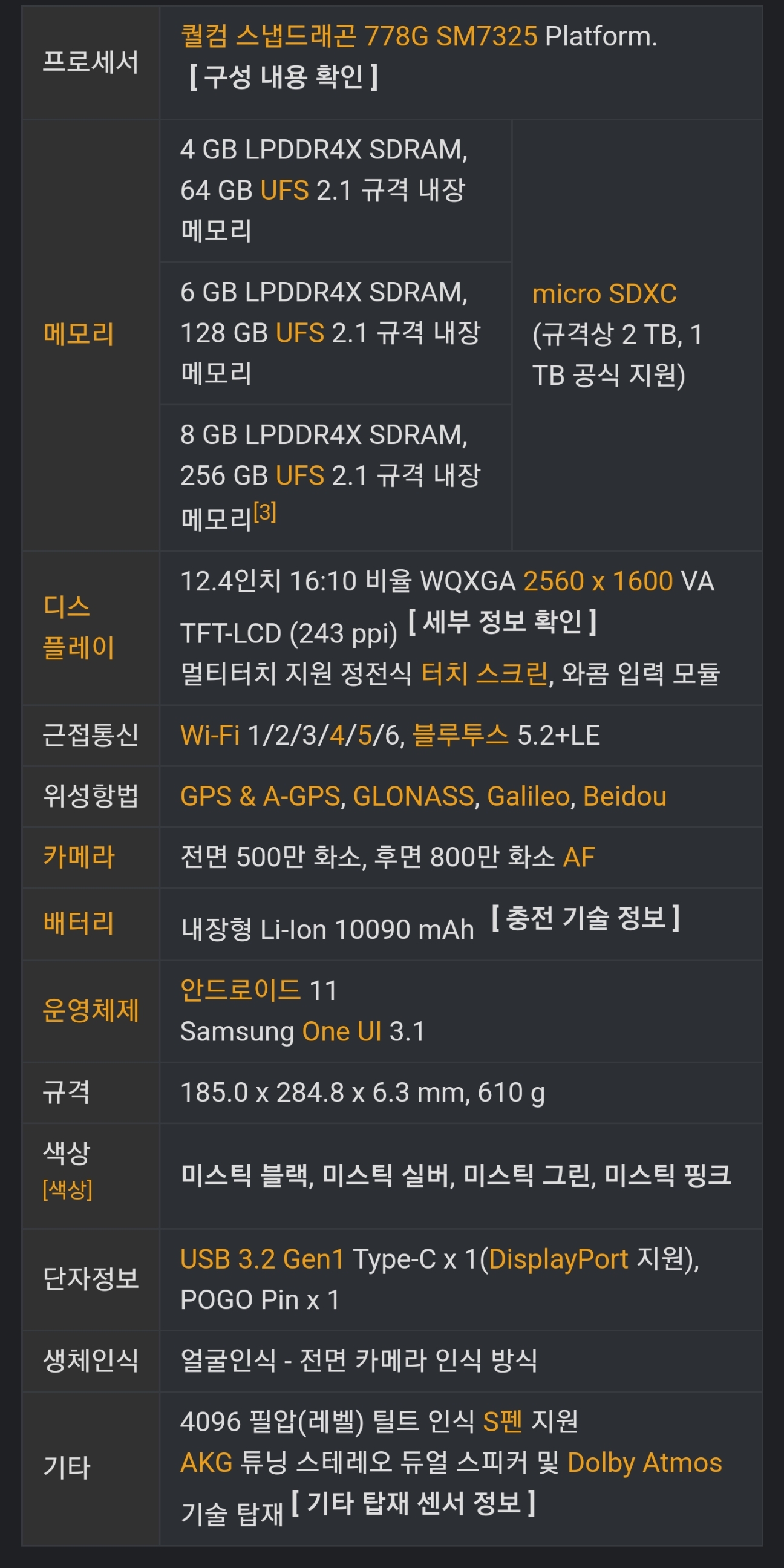 아래모델이 갤럭시 탭s7fe 모델의 스펙입니다.