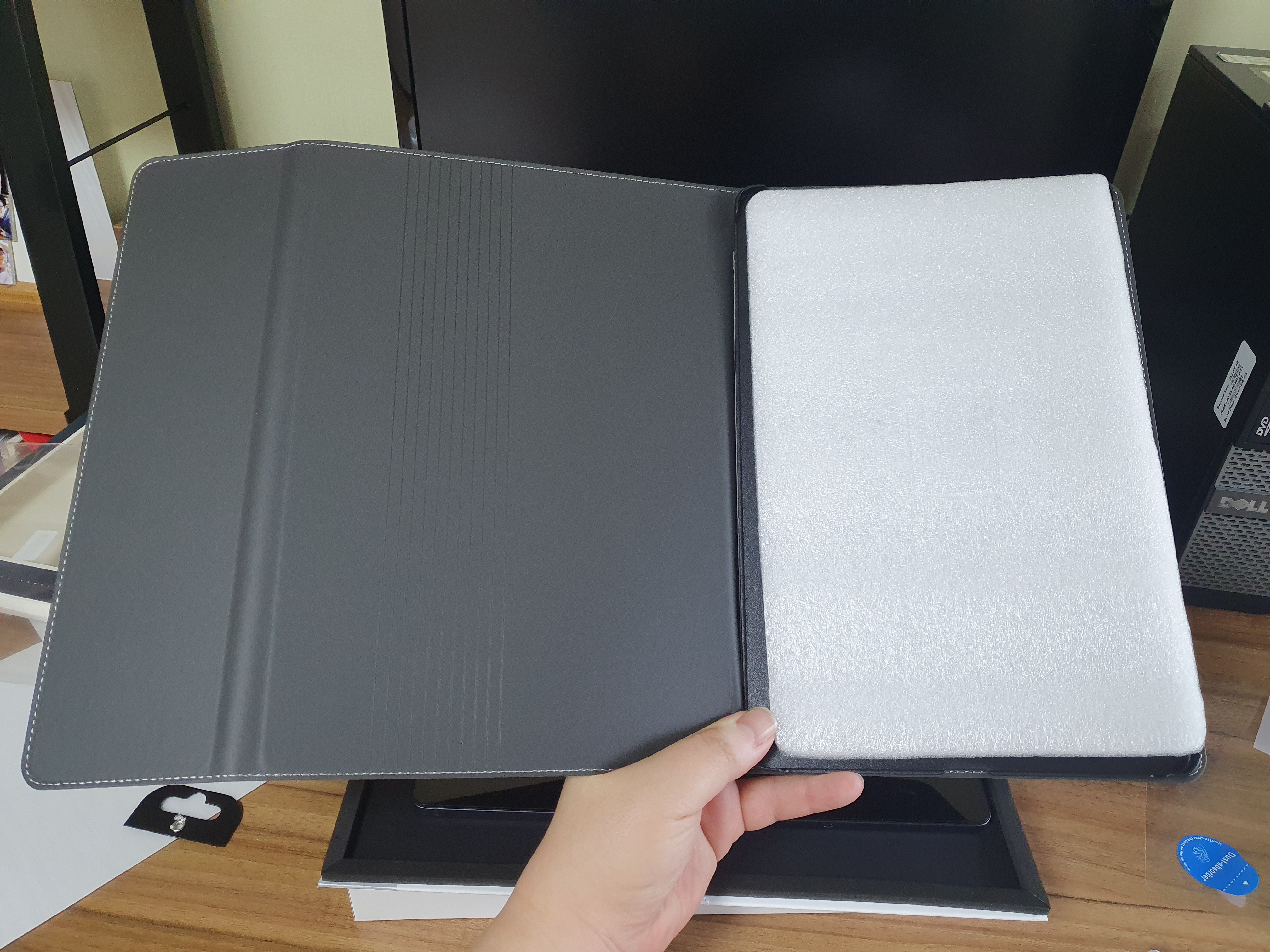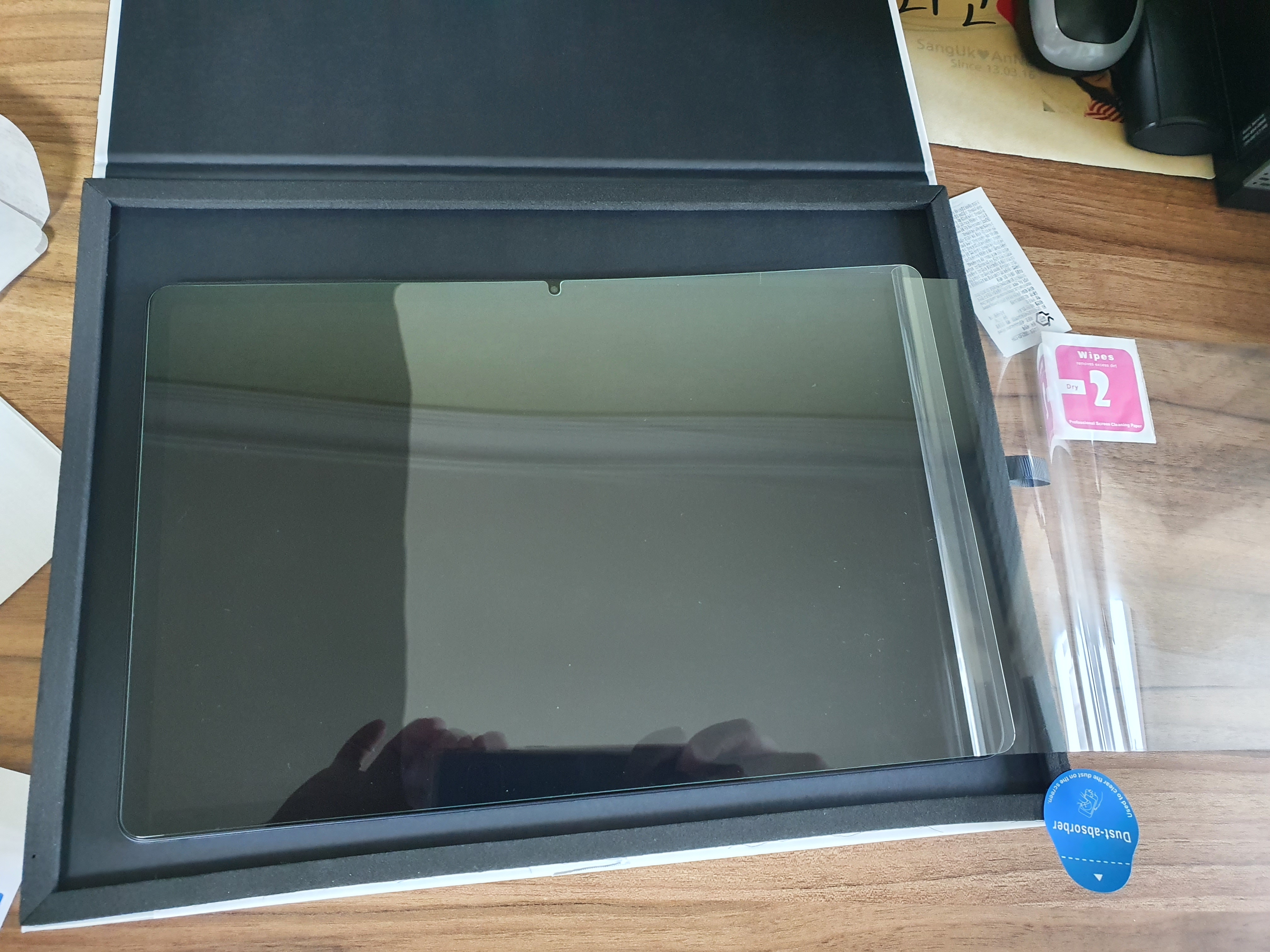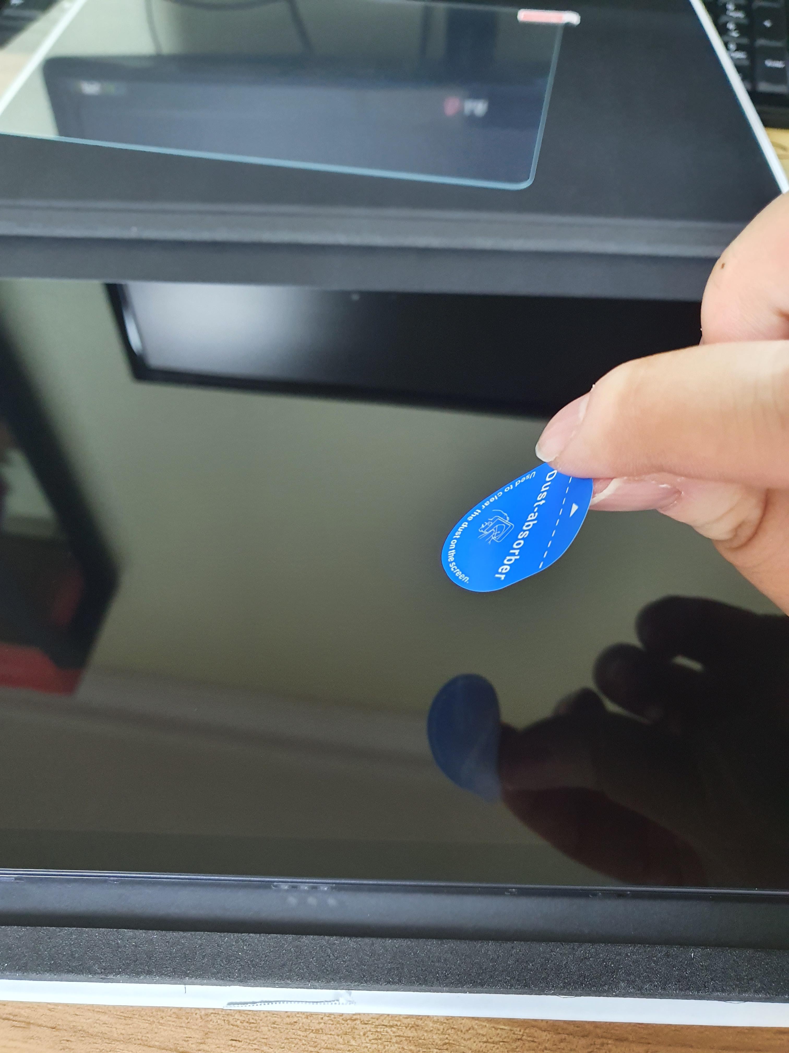 갤럭시 탭s7 fe를 꺼내고 먼지 제거 스티커를 가지고 먼지를 떼어 냅니다.
