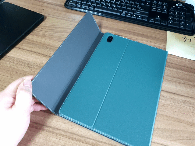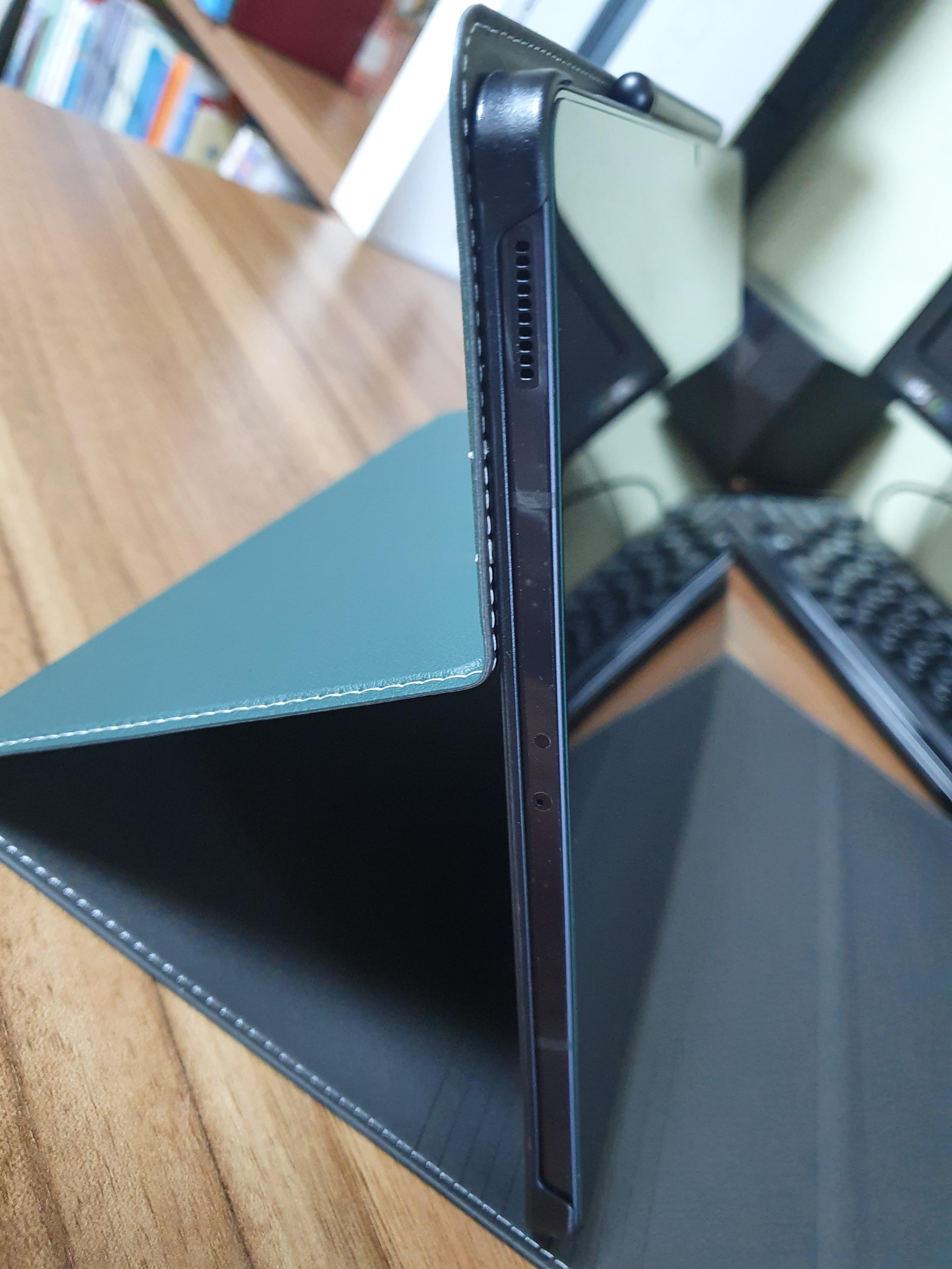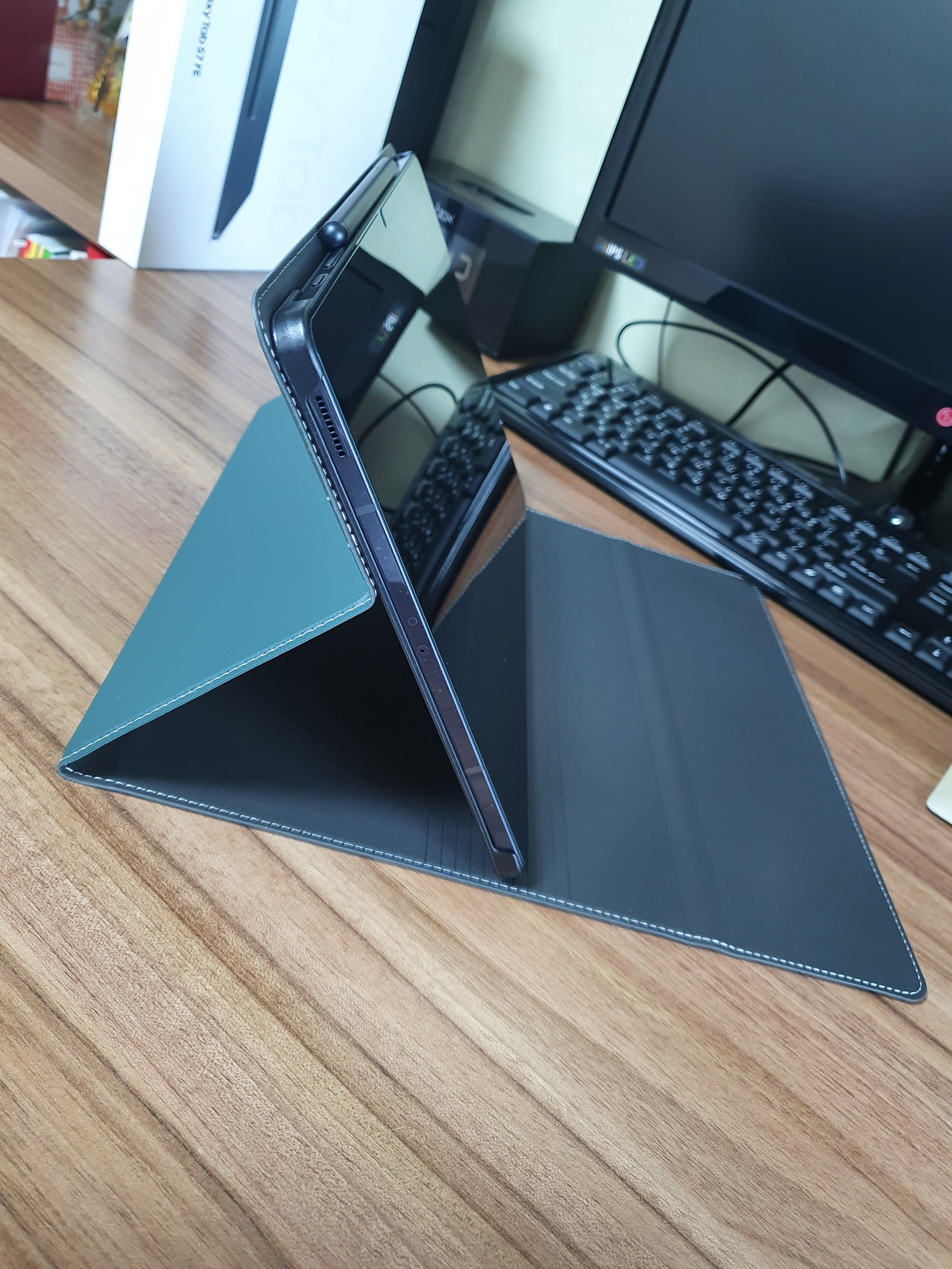 갤럭시 탭s7 fe에 비스비 북커버 케이스를 껴고 스탠딩을 하게 되면 아래와 같은 모습니다.