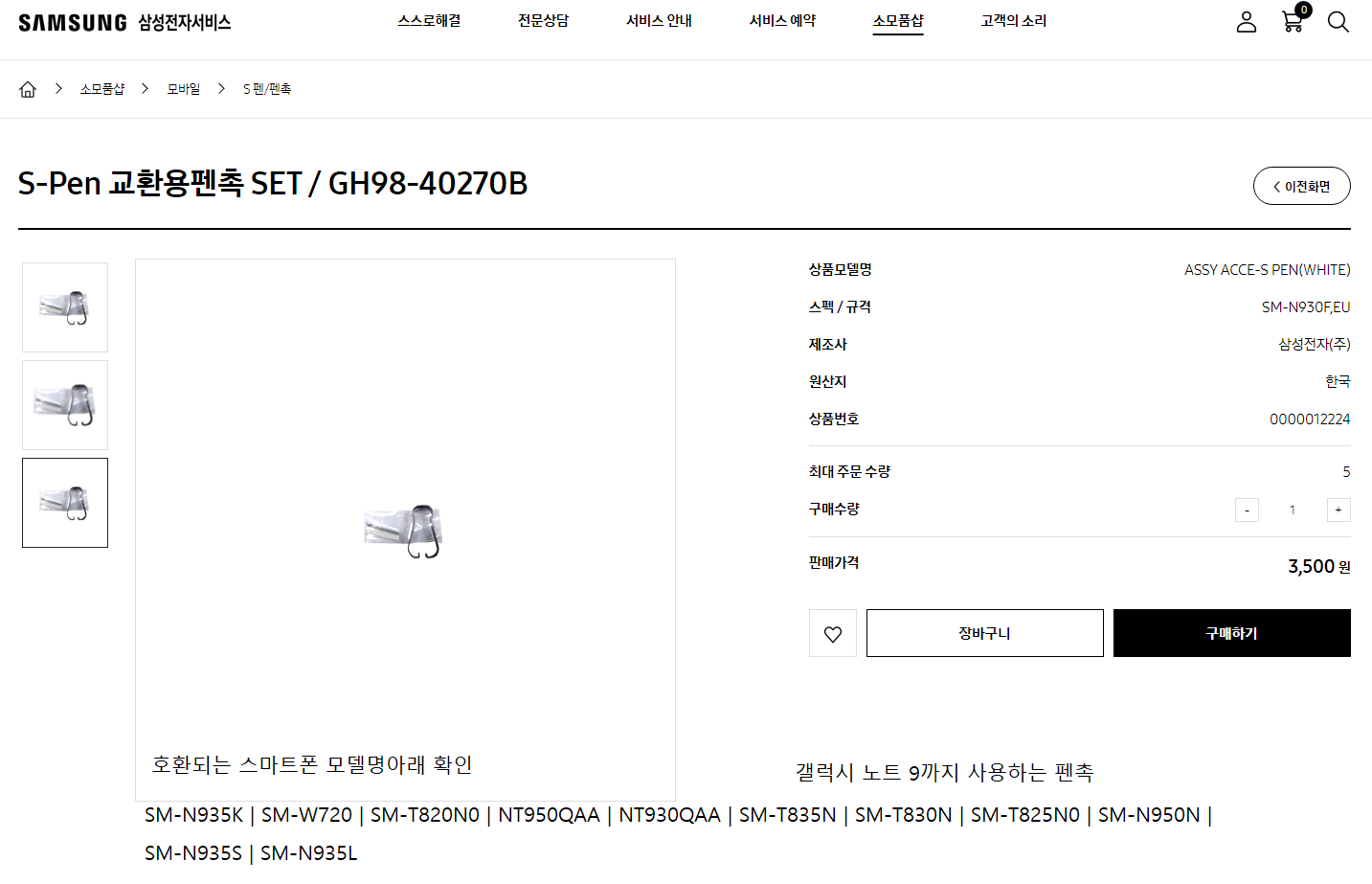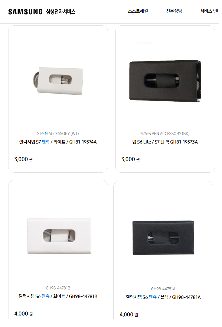 갤럭시 S펜촉 소모품을 삼성전자 서비스 홈페이지에서 찾아 봤습니다.