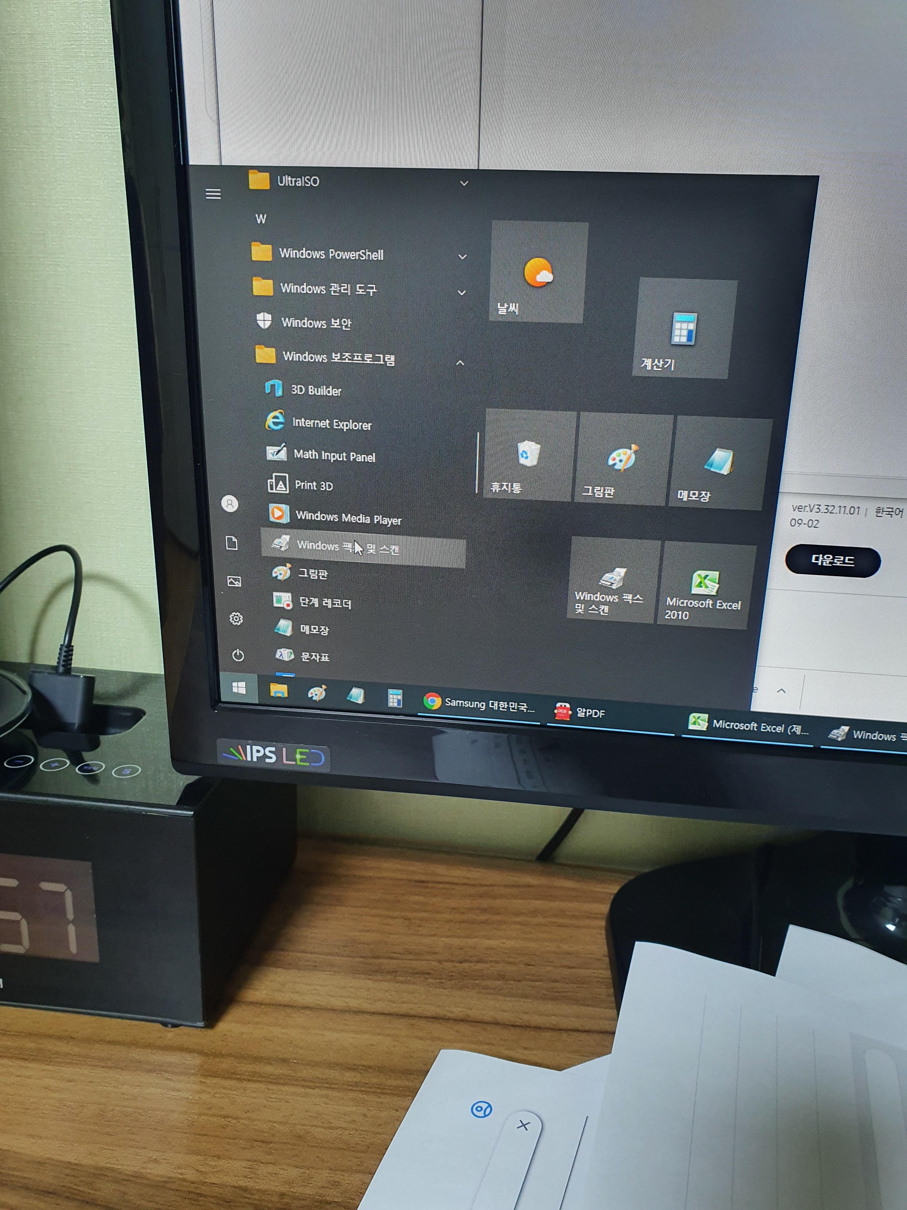 2. 그럼 컴퓨터에서 "윈도우 시작" 버튼을 누르고 보조프로그램 - WINDOWS 팩스 및 스캔 선택 을 하면