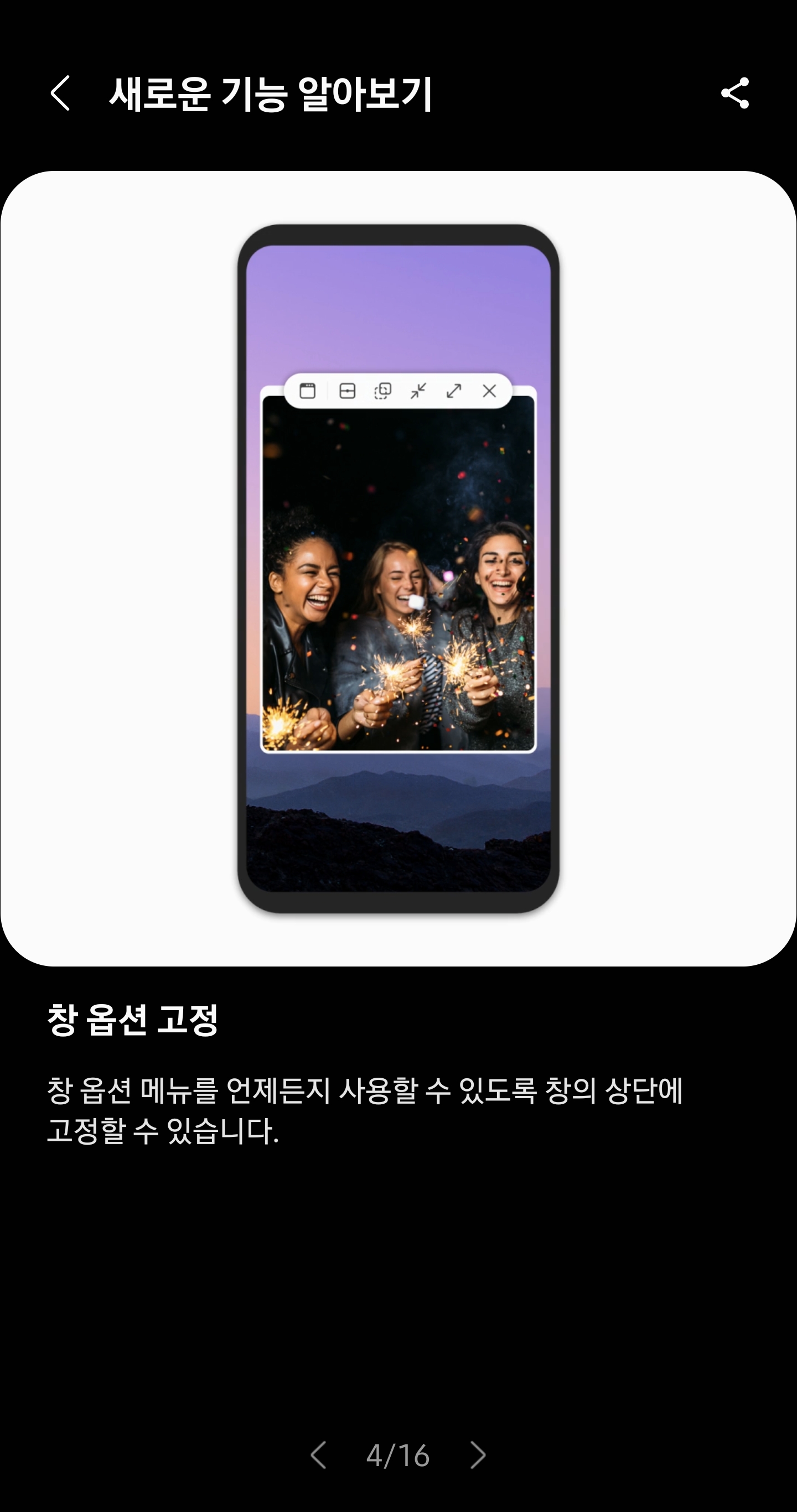 3. 멀티윈도우로 앱을 사용할때, 창의옵션 기능 없지지 않고 아래 사진처럼 고정됨.