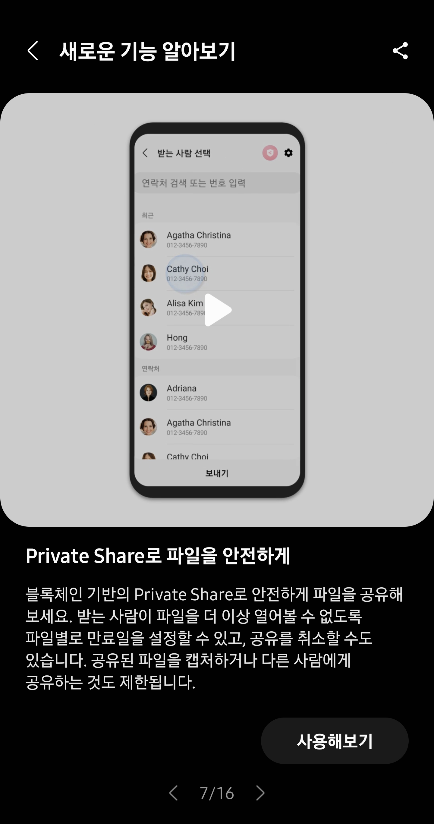 6. 프라이빗 쉐어 기능으로 파일이나 사진을 공유하는 기능을 동일한데.. 공유한 파일이나 사진을 볼수 있는 시간을 정하여 공유가 가능해짐! 똑똑한 공유 기능이라고 생각하면 됨!!