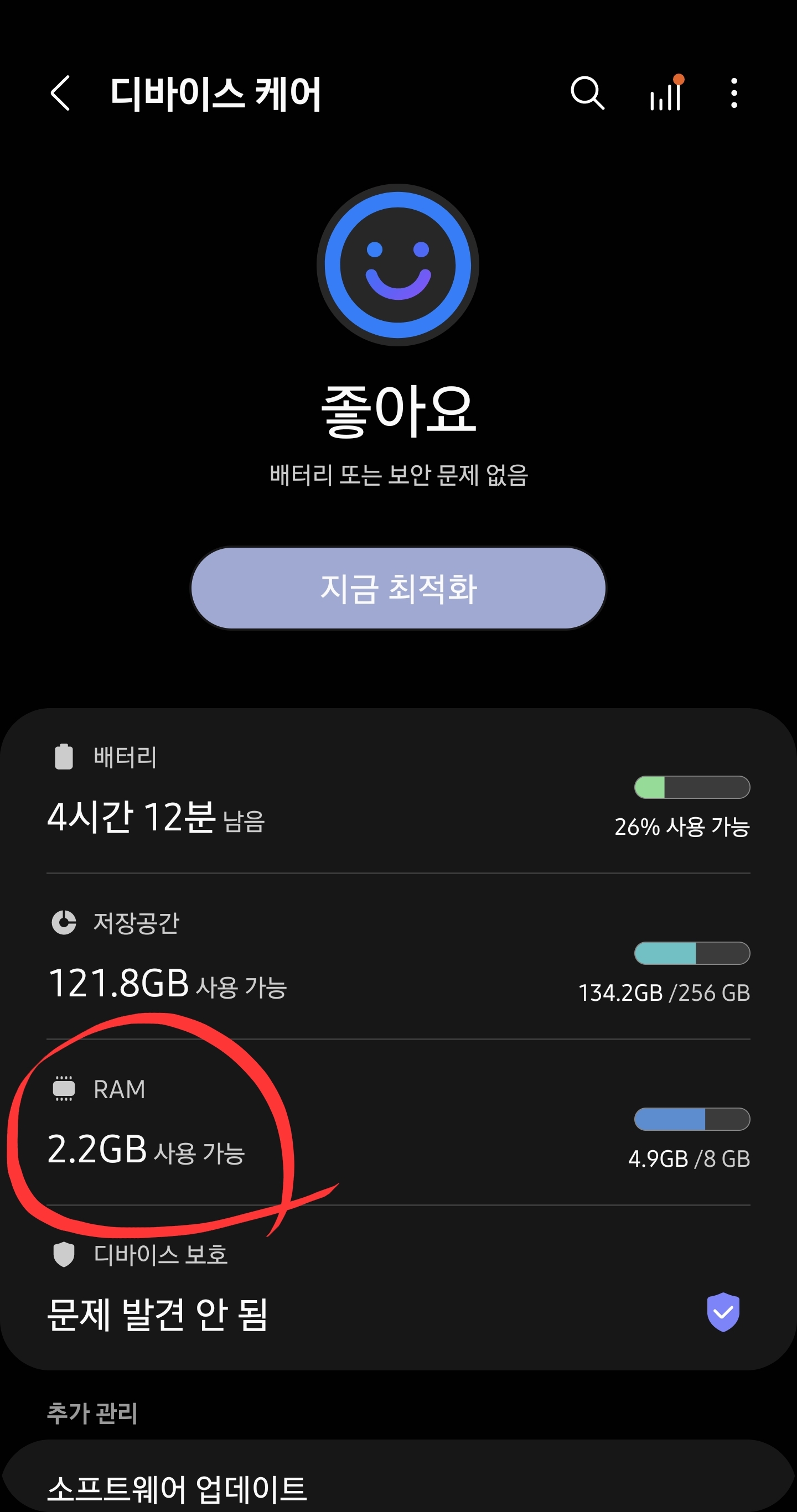 2. 디바이스 케어 메뉴중에서 "RAM"을 선택한다.