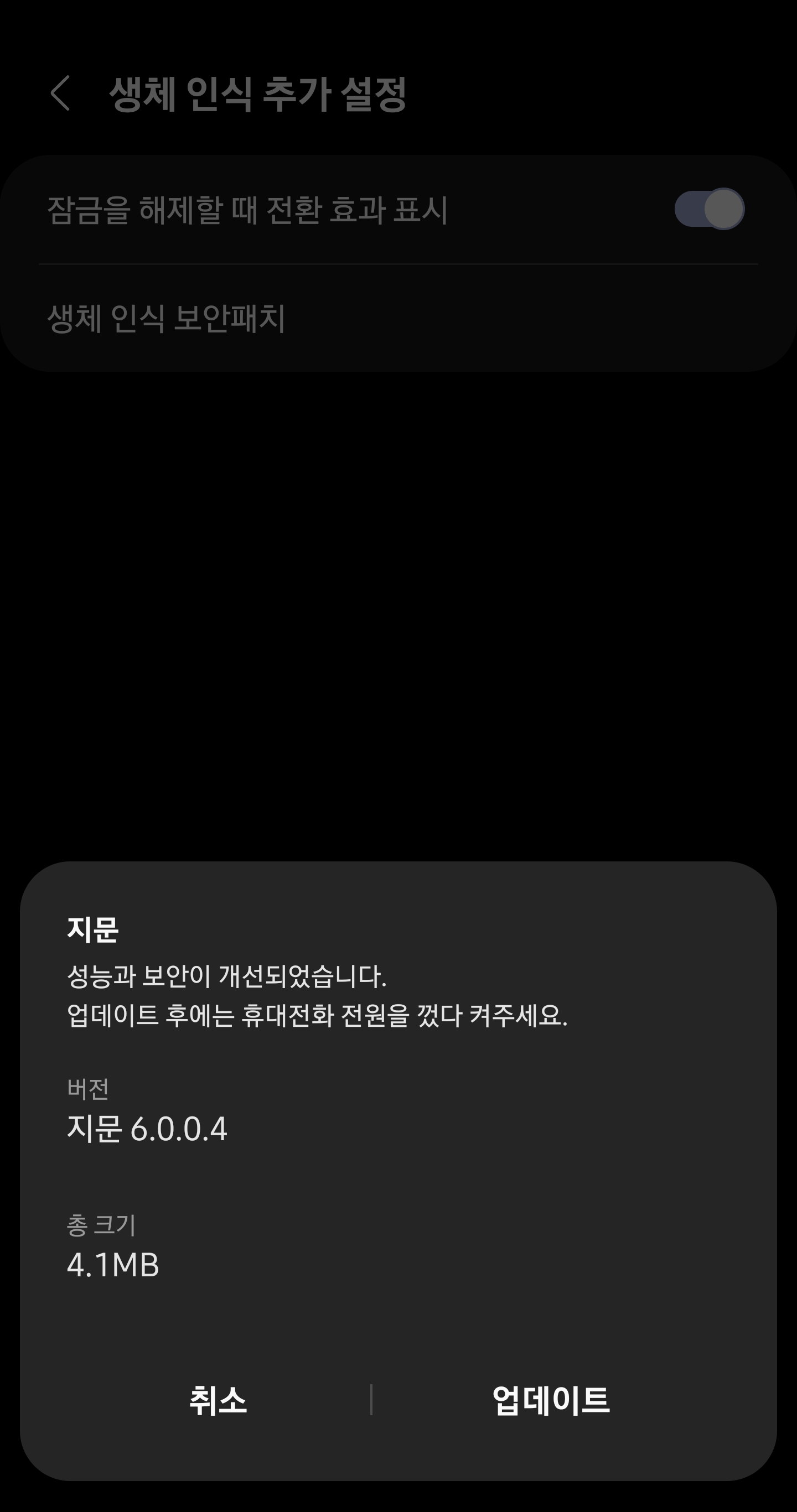 이렇게 하면 생체인식패치가 업데이트가 완료됩니다.