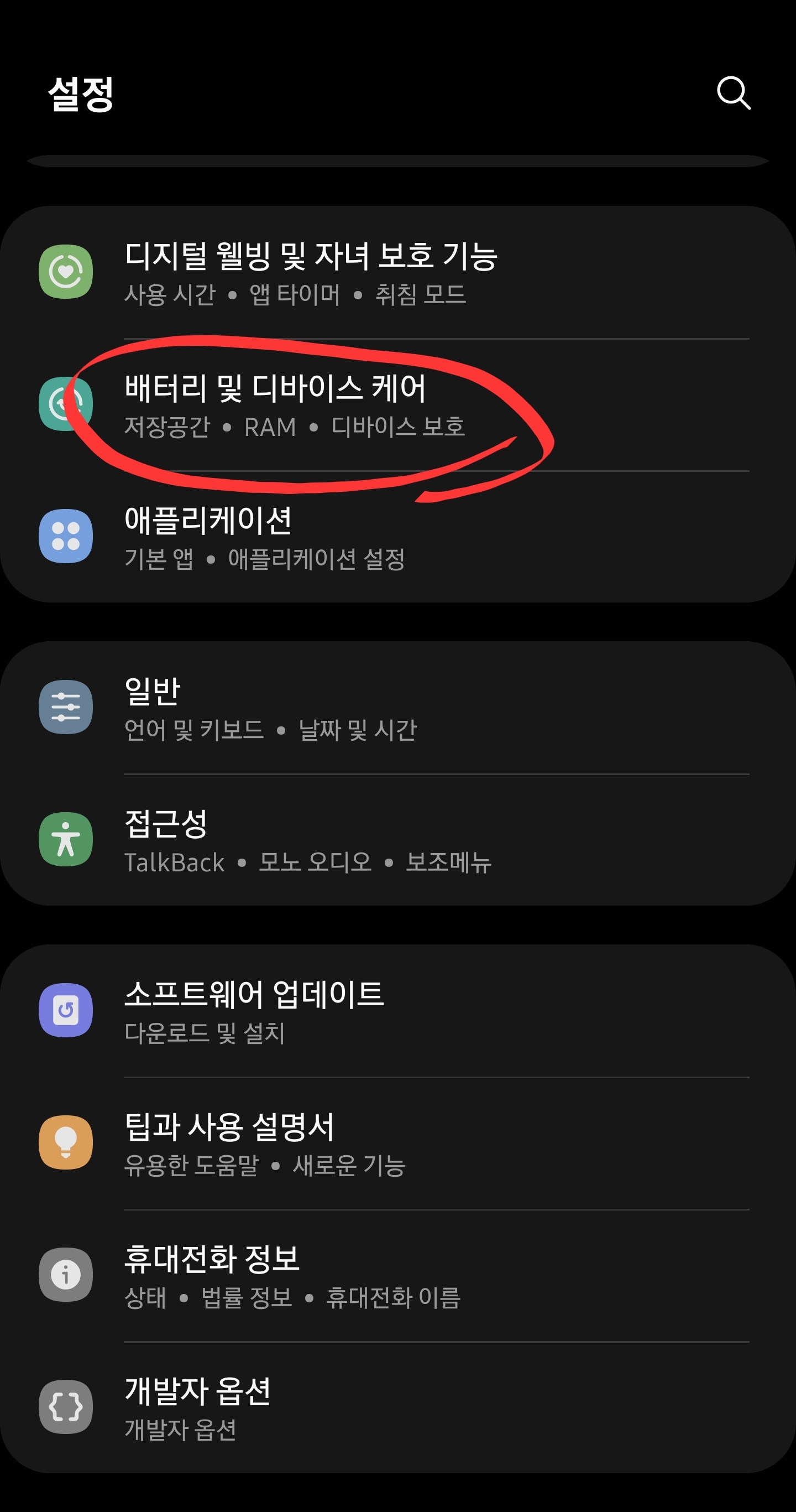 1. 스마트폰에서 설정으로 들어간 후 "배터리 및 디바이스 케어"를 선택한다.