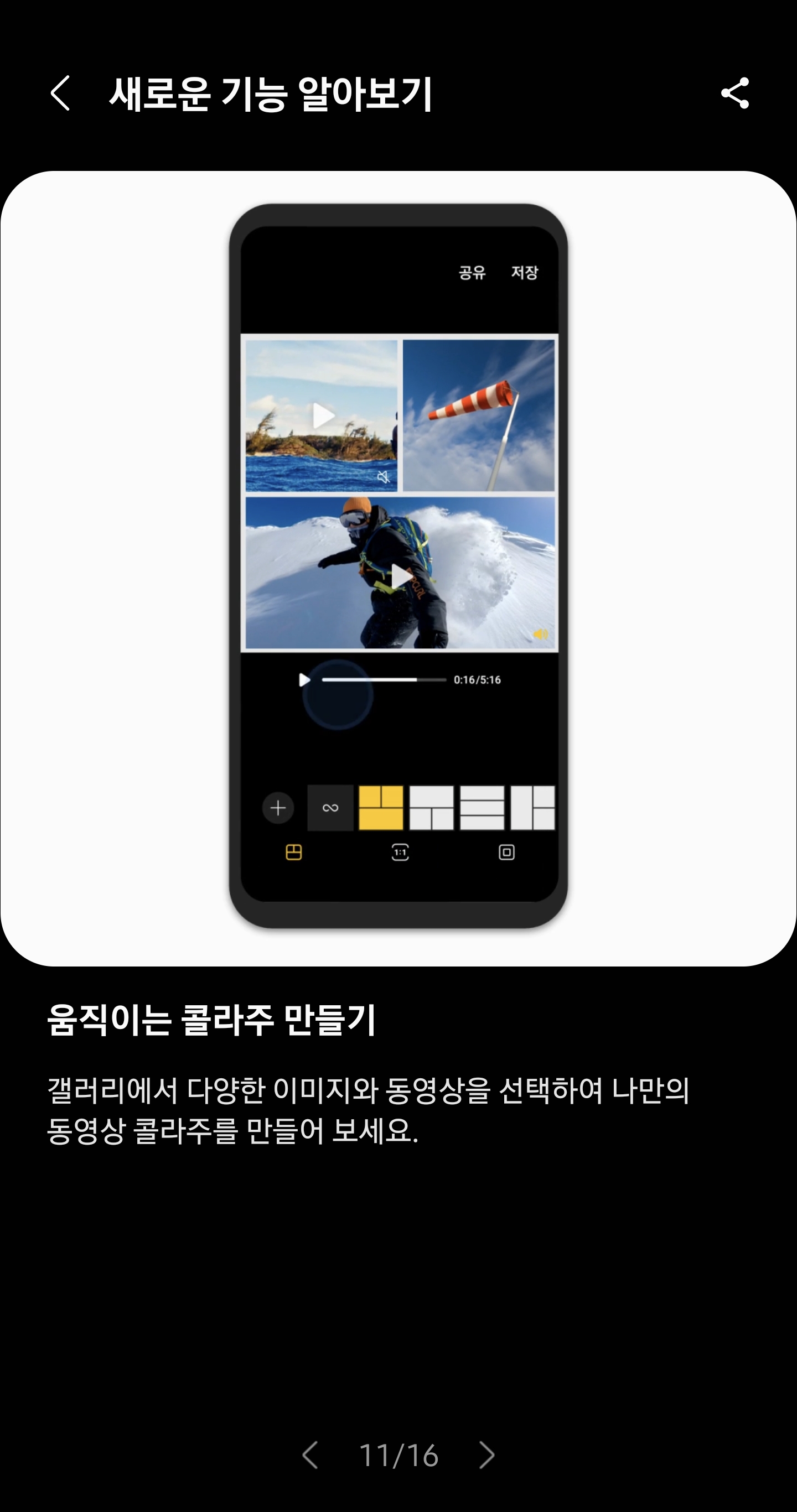 11. 갤러리 앱에서 꾸미기 기능중 콜라주 기능에서 동영상으로 콜라주를 만들수 있음.