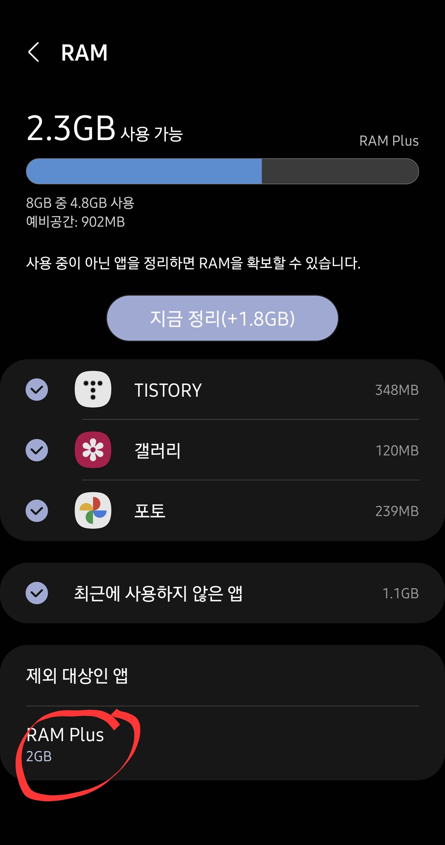 3. 그럼 맨아래에 "RAM Plus" 라는 메뉴가 보일것이다. 그걸 선택한다.