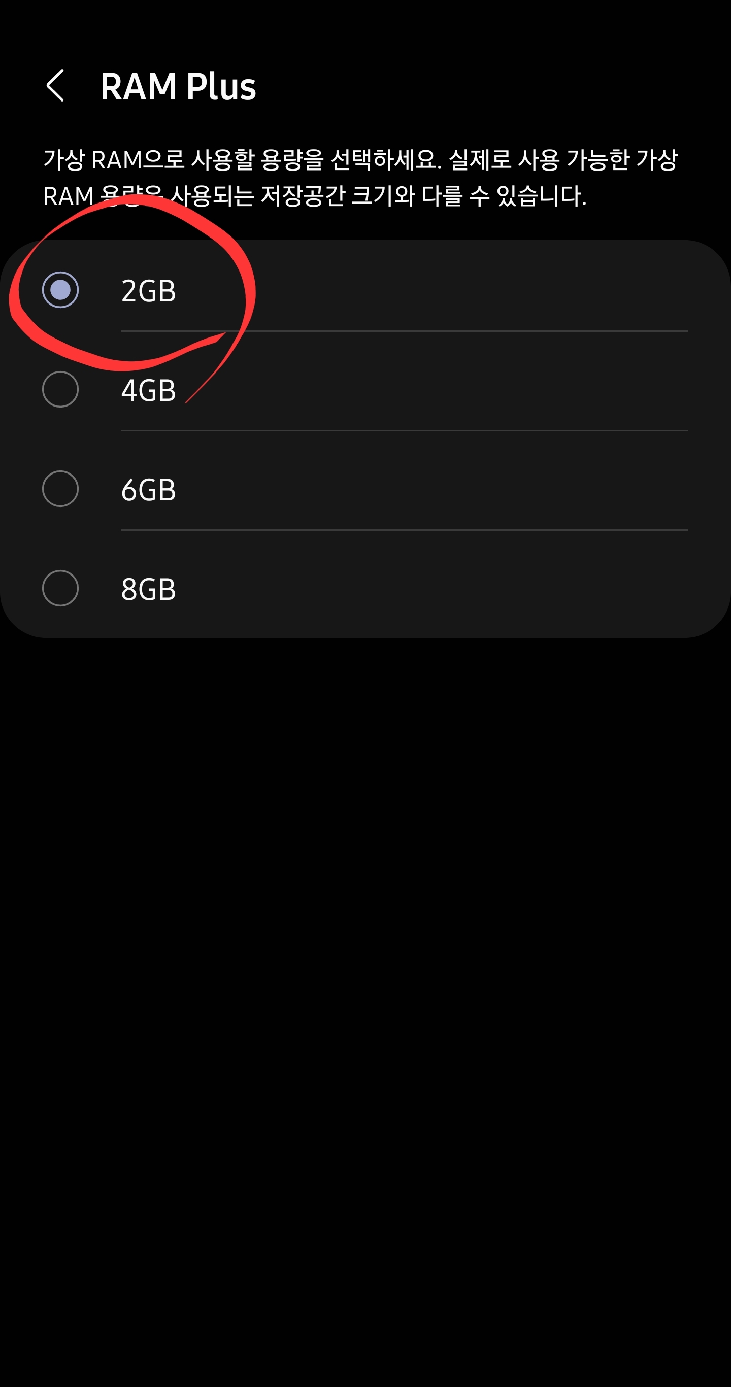 4. "RAM Plus" 라는 메뉴를 선택하면, 가상램 용량을 어떤걸로 할지 선택이 가능하다. 기본은 4GB로 설정이 되어 있는데.. 난 굳이 기본램이 8기가인데.. 4기가를 추가할 필요성을 못느껴서 2GB로 설정하였다.