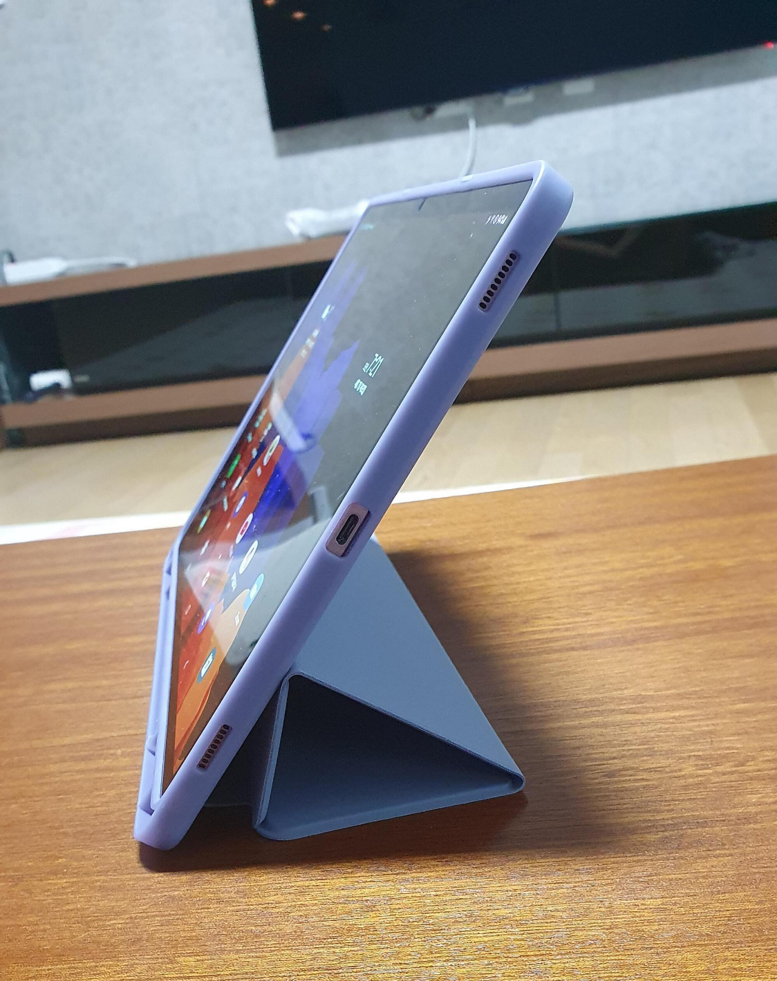 갤럭시탭s7+가 사용한 패널이 아몰레드라서 시야각이 좋아서 각도 조절이 되지 않더라도 보는데 지장은 없을듯합니다.