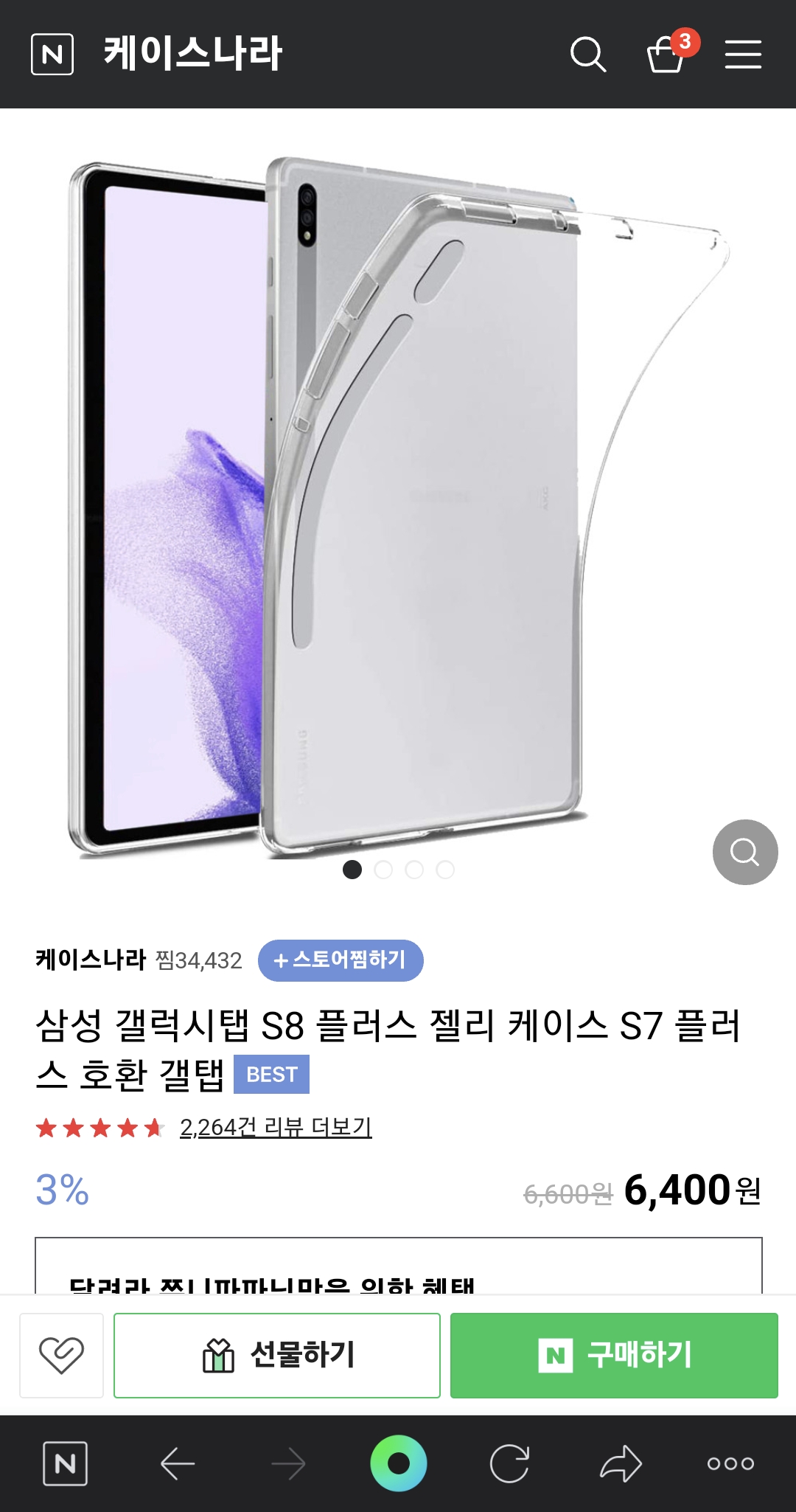 무료배송에 6400원에 1개의 갤럭시탭 s7+ 젤리 케이스를 얻을수 있어서 전 여기서 구매했습니다.