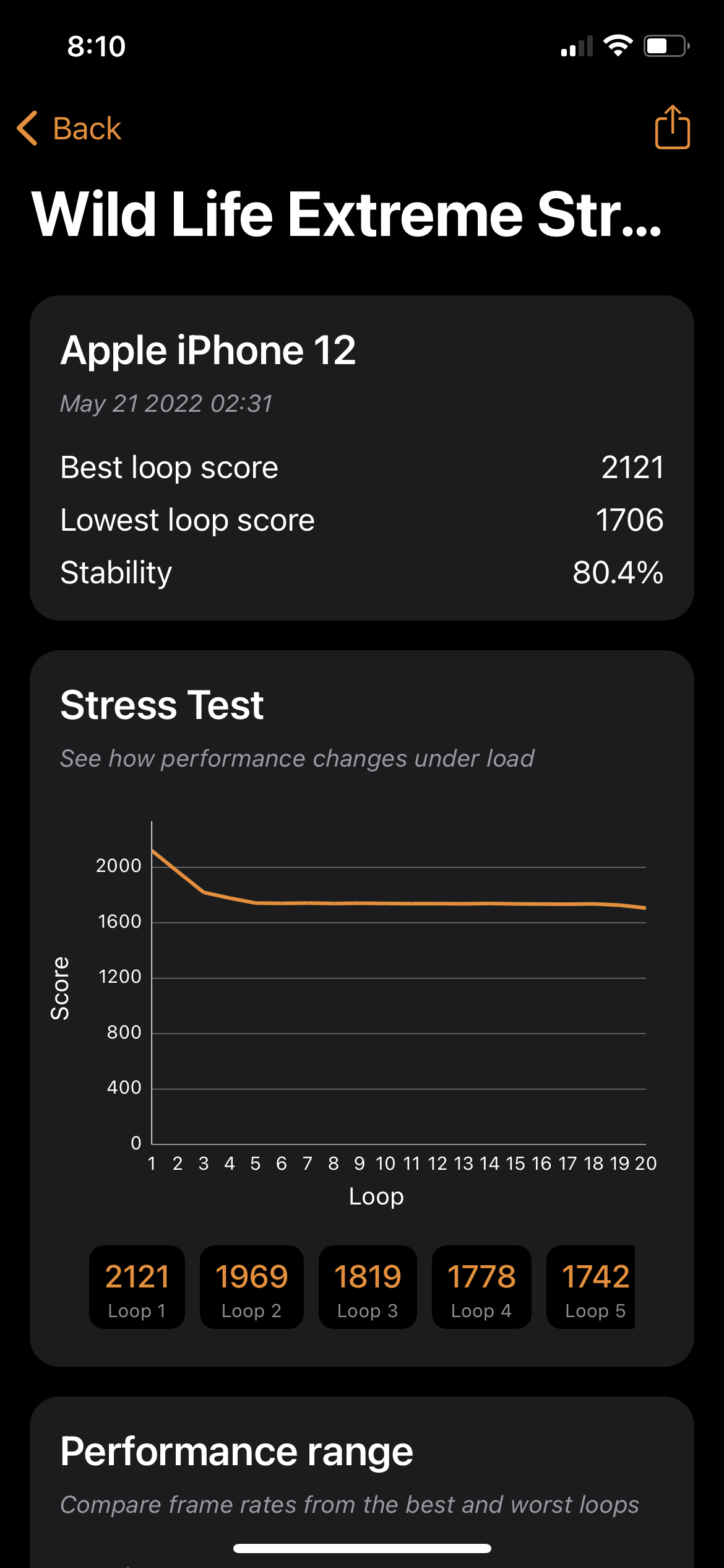 아이폰12 익스트림 스트레스 테스트 최고점 : 2121점