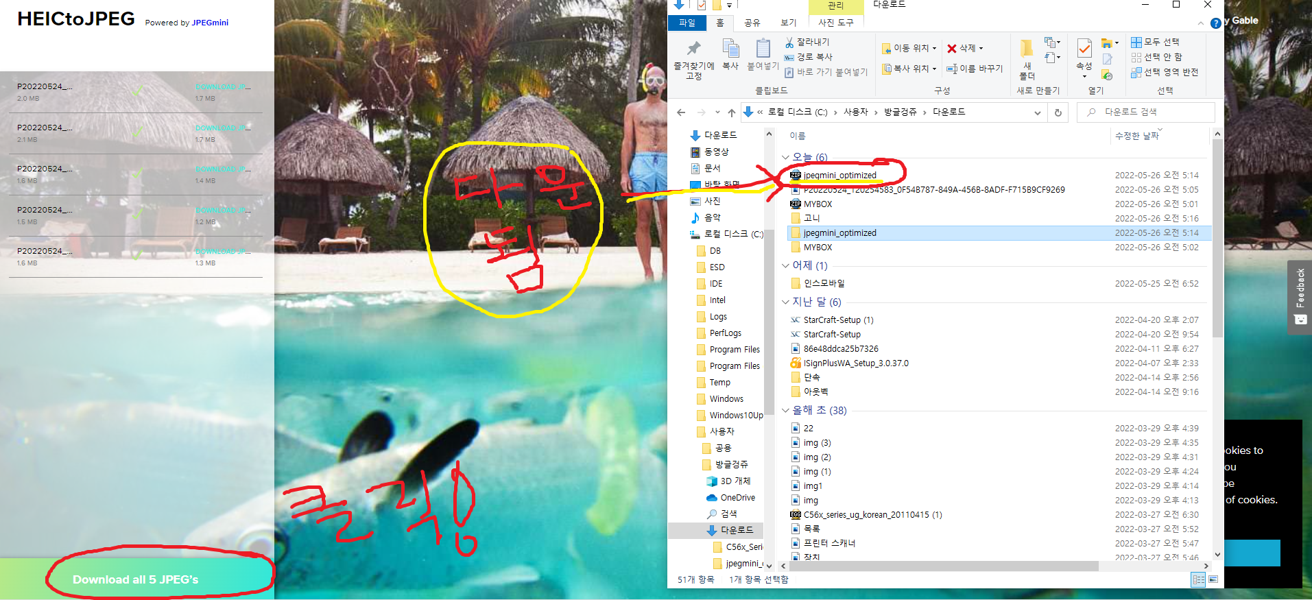 이 파일의 압축을 풀어주면, HEIC 파일이 JPG 파일로 변환이 되어 있을겁니다.