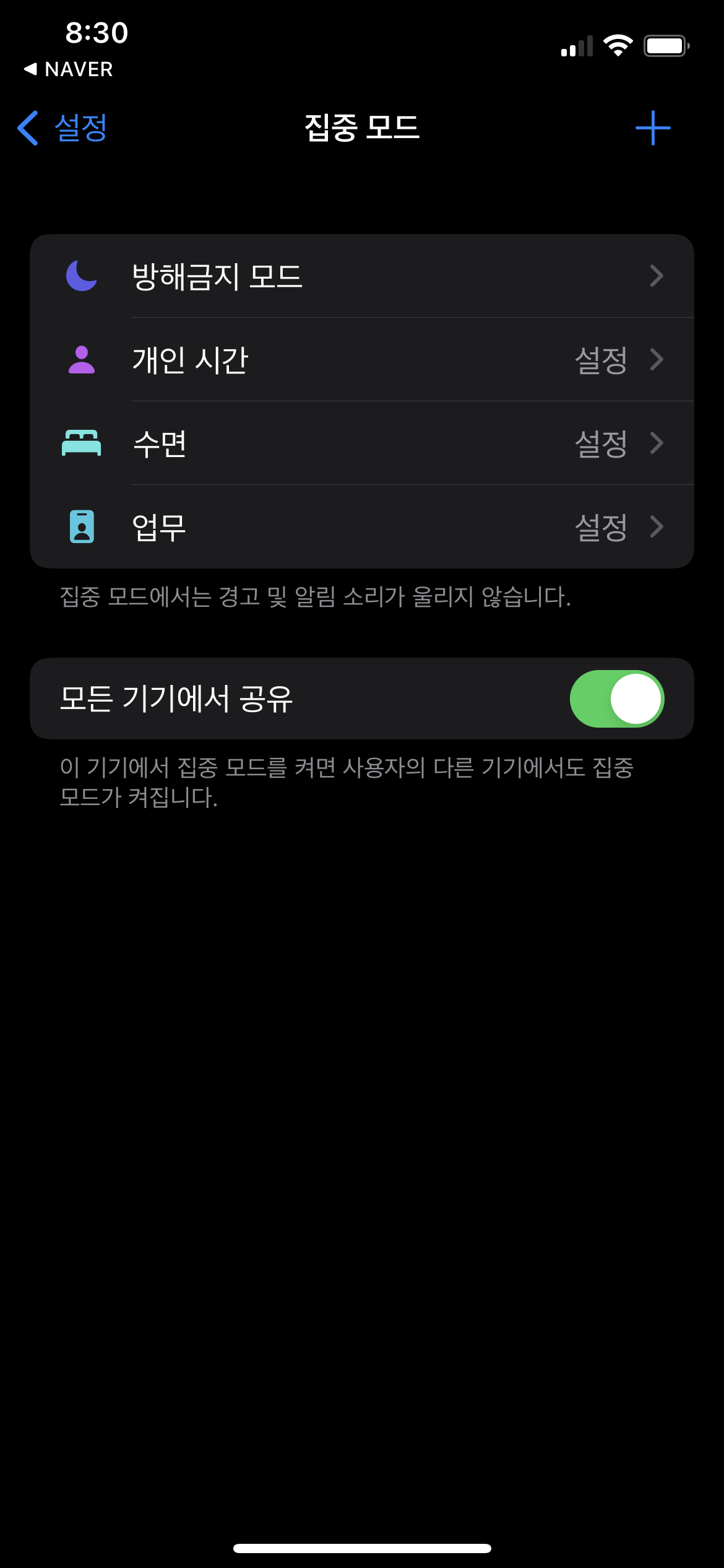 일반 방해금지모드, 개인시간모드 업무모드, 수면모드 그리고 새로운 집중모드도 만들수가 있습니다.