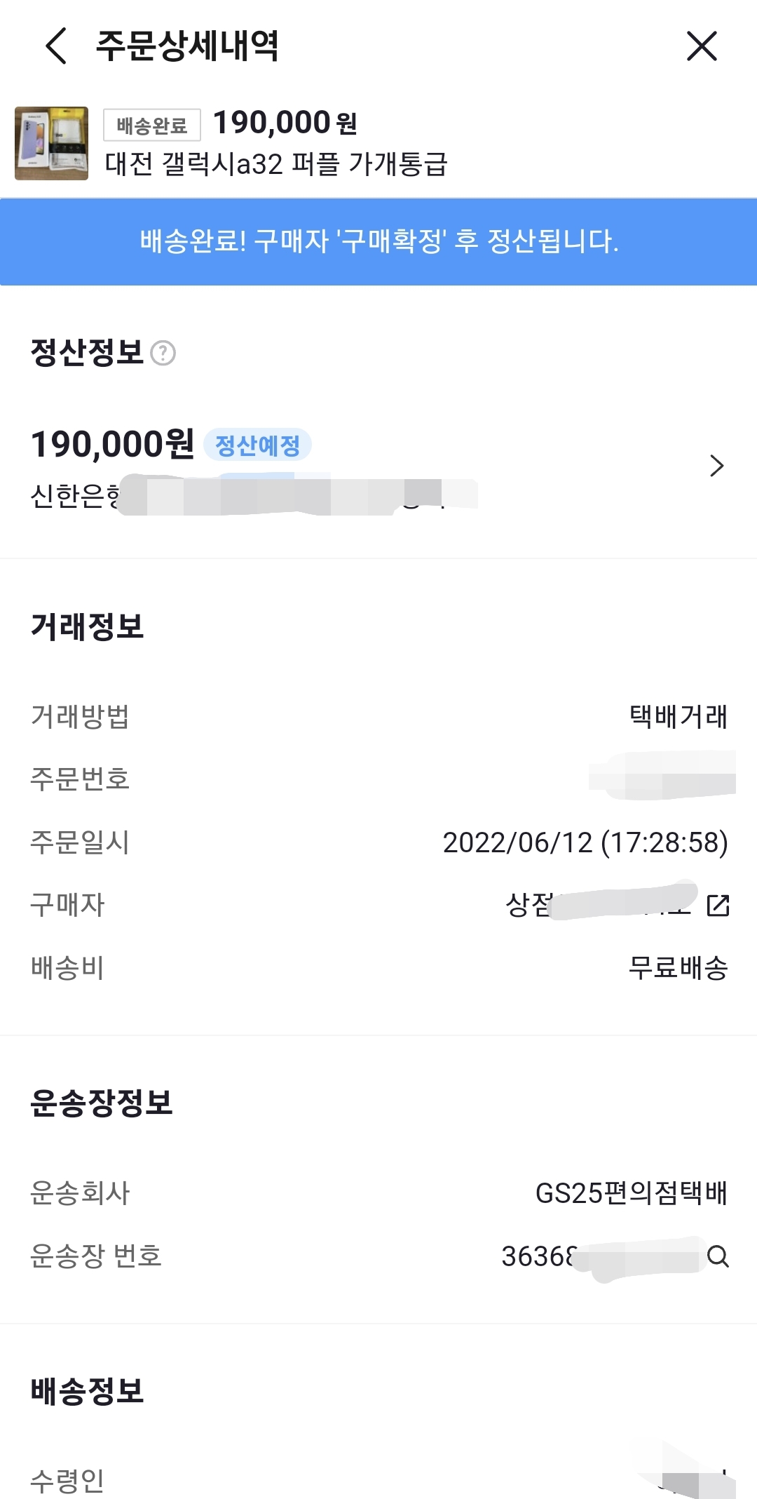 : 판매자는 구매품을 포장을 잘해서 택배를 발송하고, 택배번호를 번개장터 주문상세내역에다 송장번호를 입력해 줍니다.