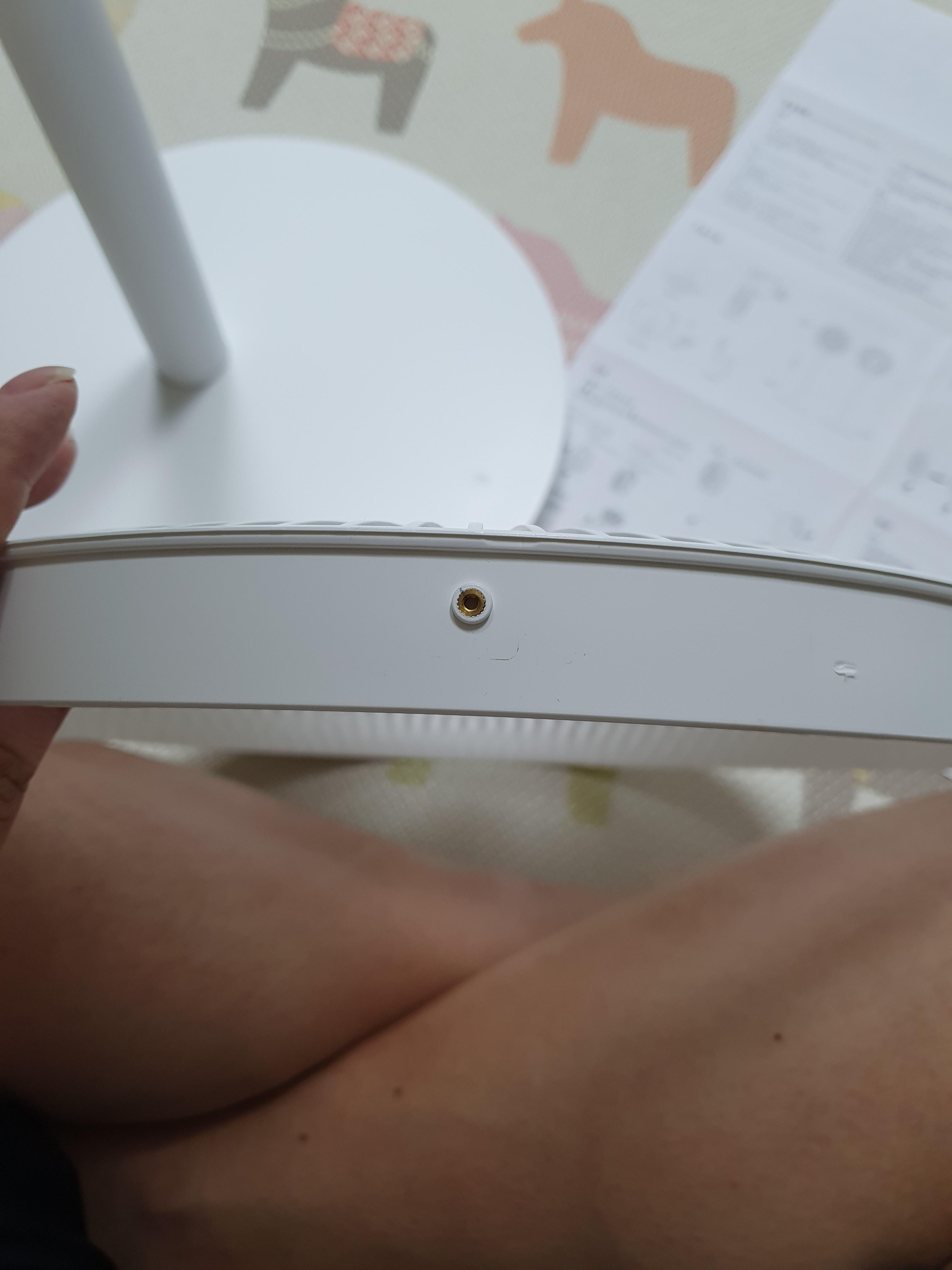 고정이 되면, 선풍기 망의 6시방향에 볼트 돌리는 구멍이 하나 보입니다.