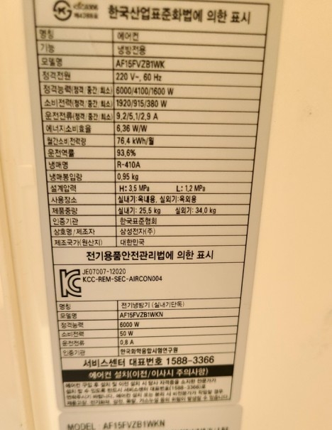 삼성전자 에어컨 모델명 : AF15FVZ81WK 입니다.