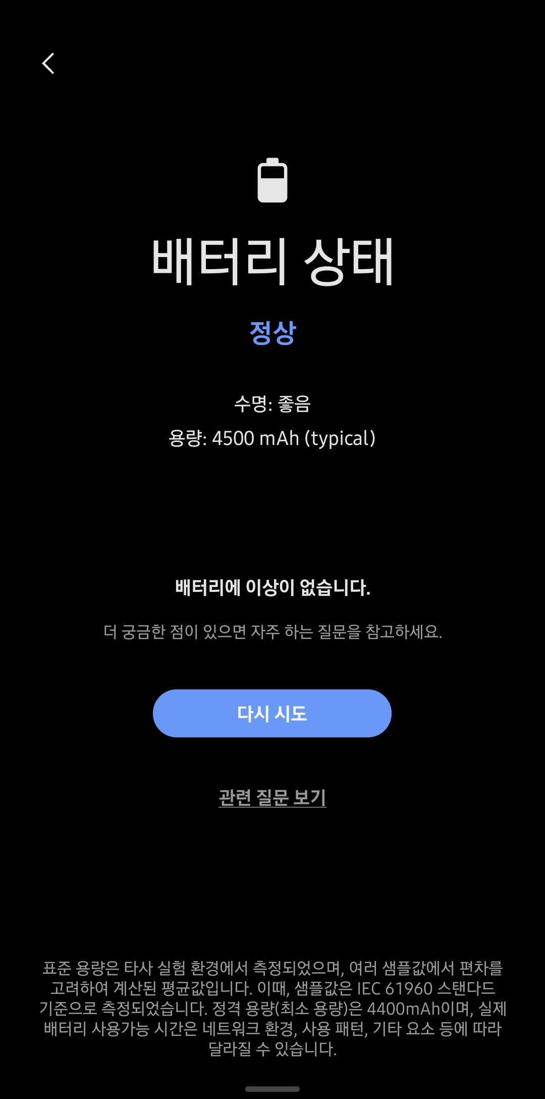 갤럭시s10 5g의 베터리는 성능 좋음이고, 상태 이상없음으로 뜨네요.