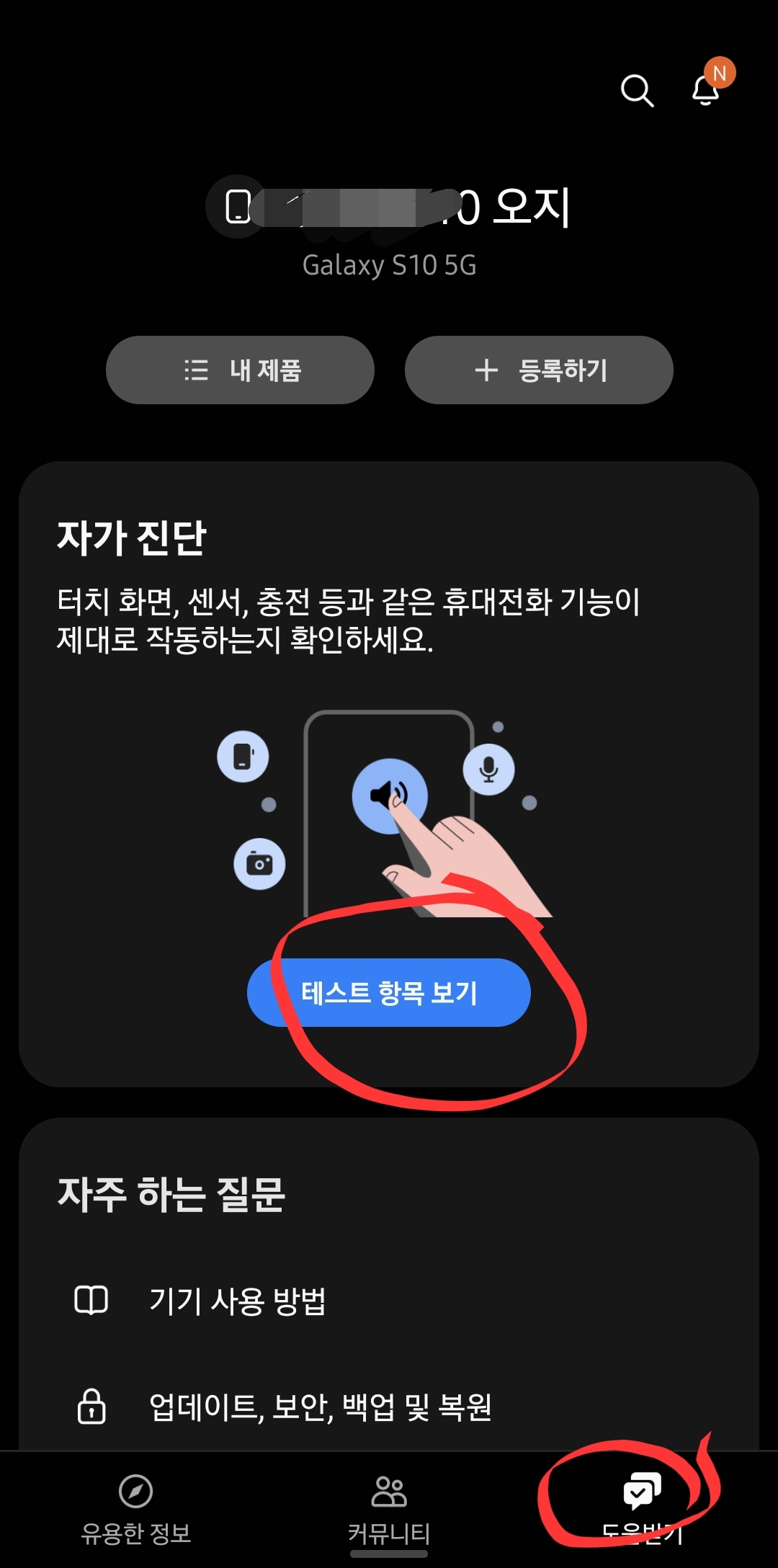4. 앱을 실행하면, 맨아래 오른쪽에 있는 "도움받기"를 선택하고, "테스트 항목 보기"를 선택합니다.