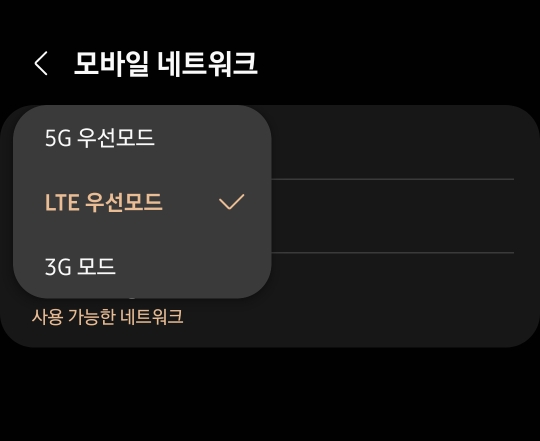 설정-연결-데이터네트워크 방식 - 모바일 네트워크- LTE 우선모드 선택
