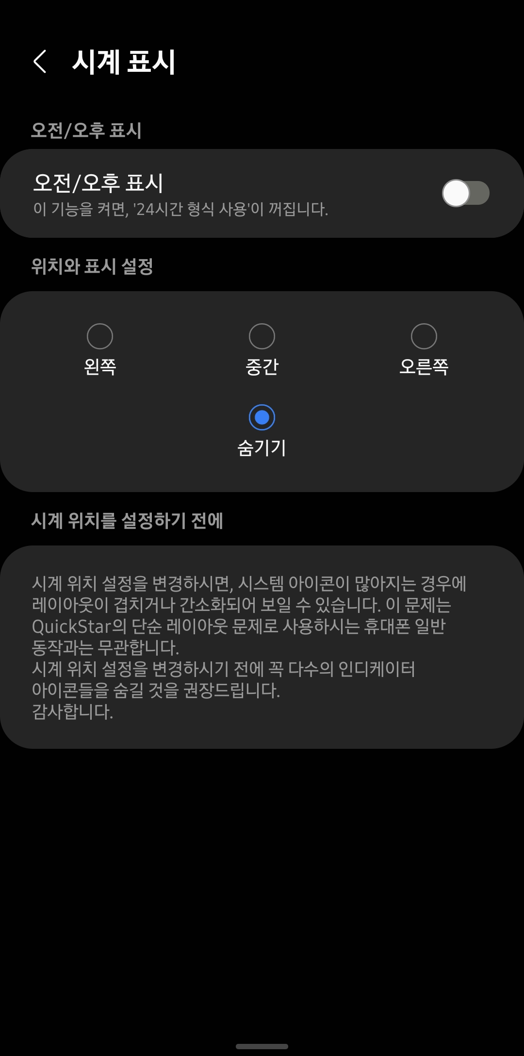 5. 그럼 시계 표시 메뉴에서 시계의 위치나 숨기기를 설정할수가 있습니다. 원하는대로 설정하세요.