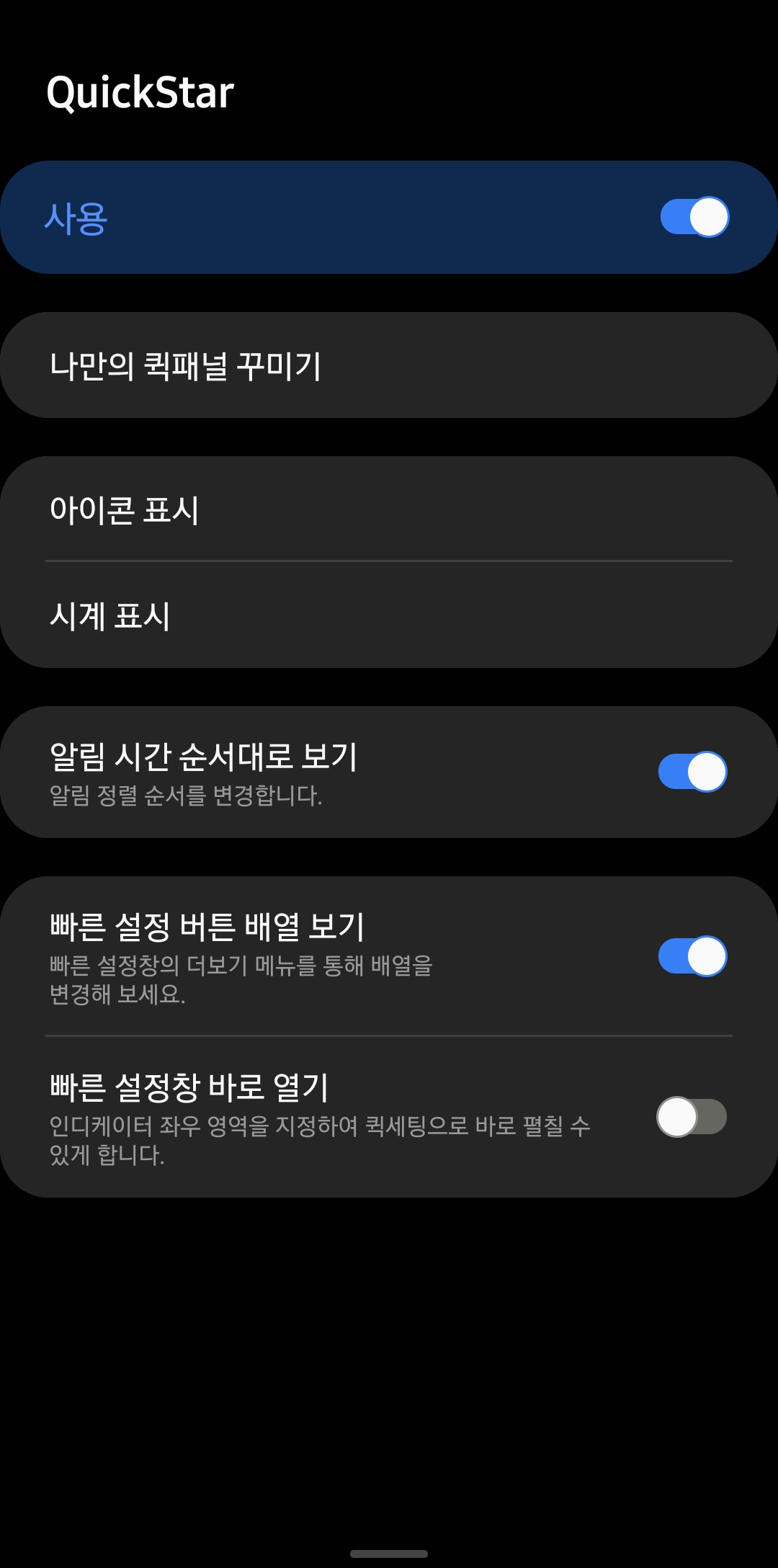 4. Quick Star 어플로 들어오면, 맨위에 사용을 활성화 해주고, 시계표시를 선택합니다.
