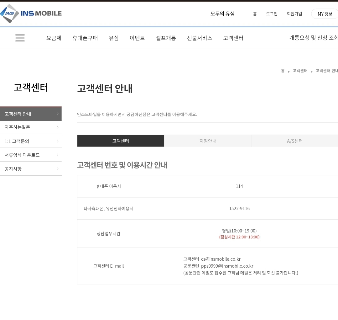 인스모바일 고객센터 전화 번호 : 1522-9116