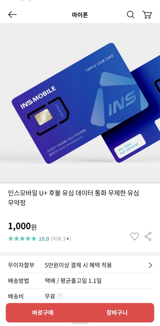 1000원에 인스모바일 유심을 구매할수 있더군요.