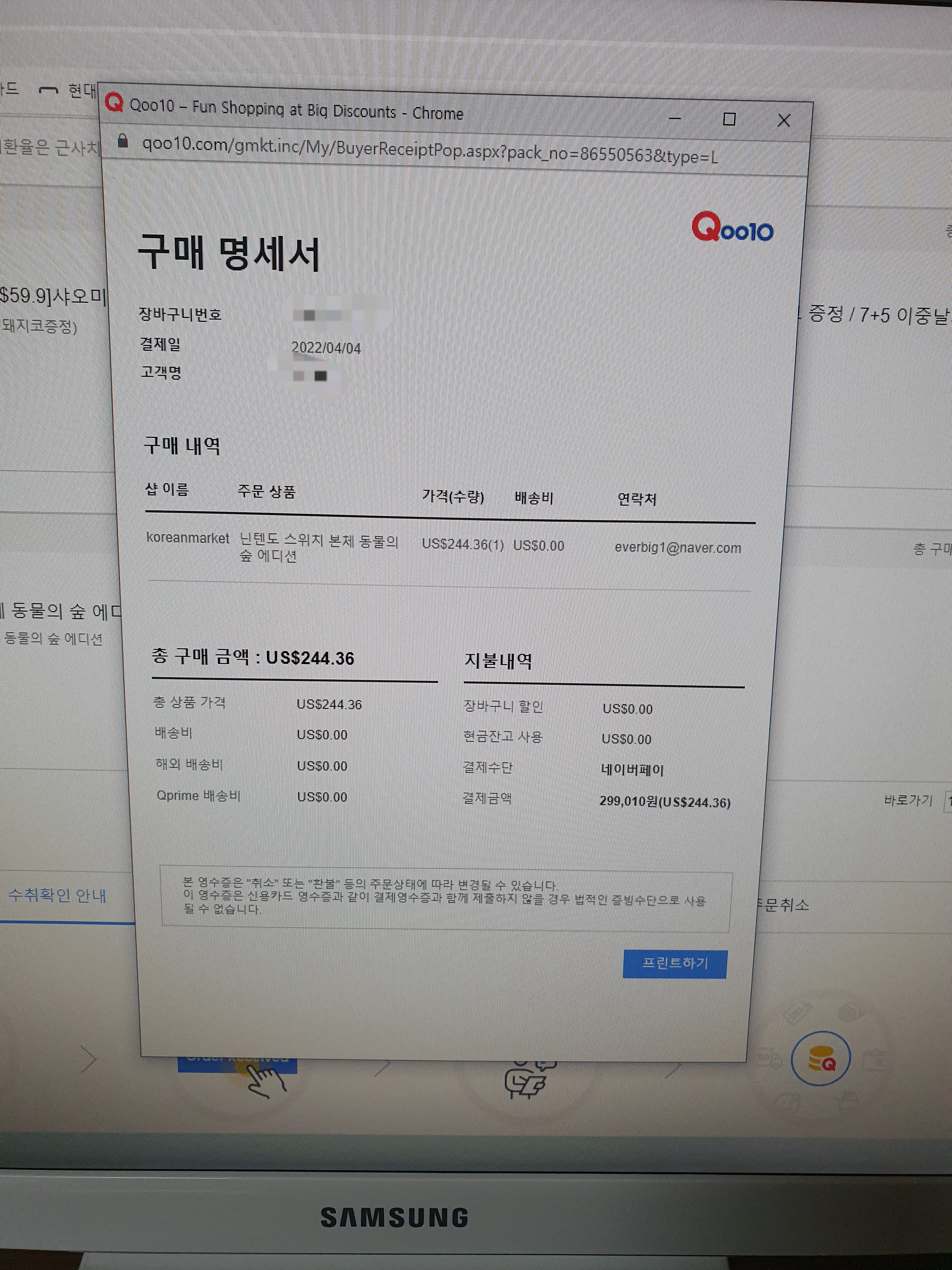 나같은 경우에는 큐텐에서 구매를 해서 큐텐 홈페이지에서 구매 영수증을 프린트 하였다.