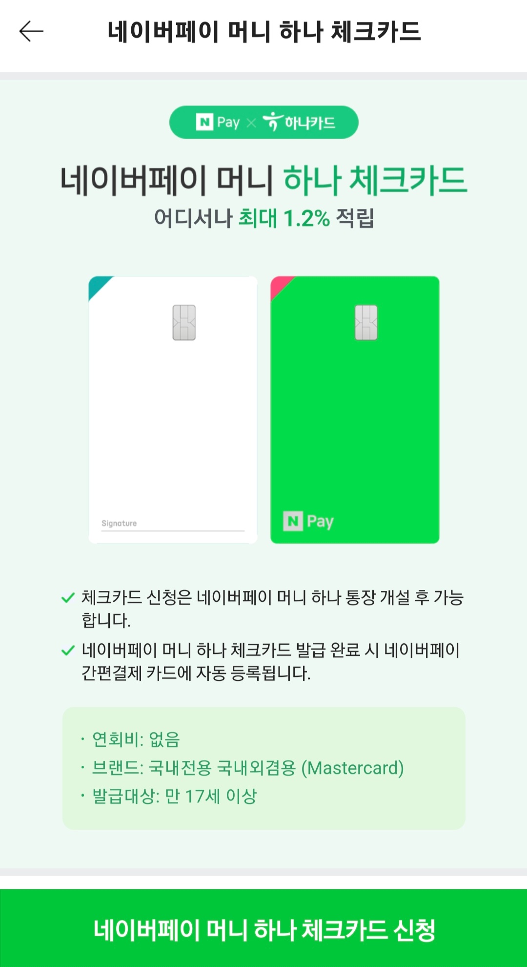 바로 "네이버 페이머니 하나 체크카드" 입니다.