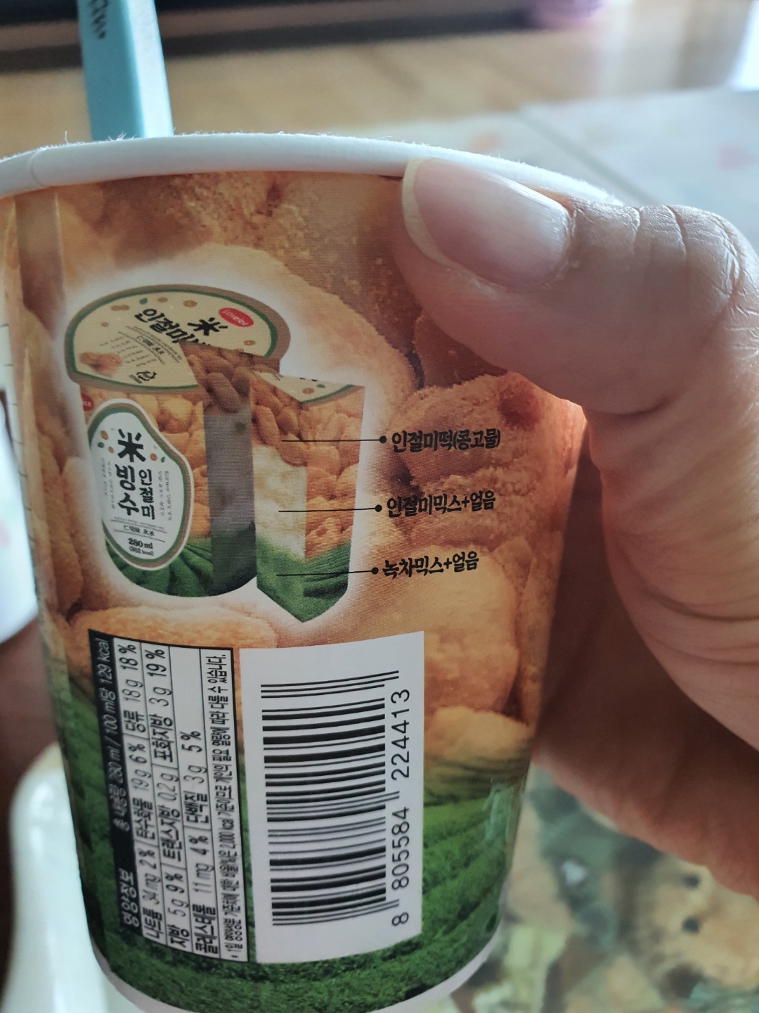 콩고물이 묻혀진 인절미가 맨 위에 있고, 그 밑에 인절미+얼음이 들어 있고,