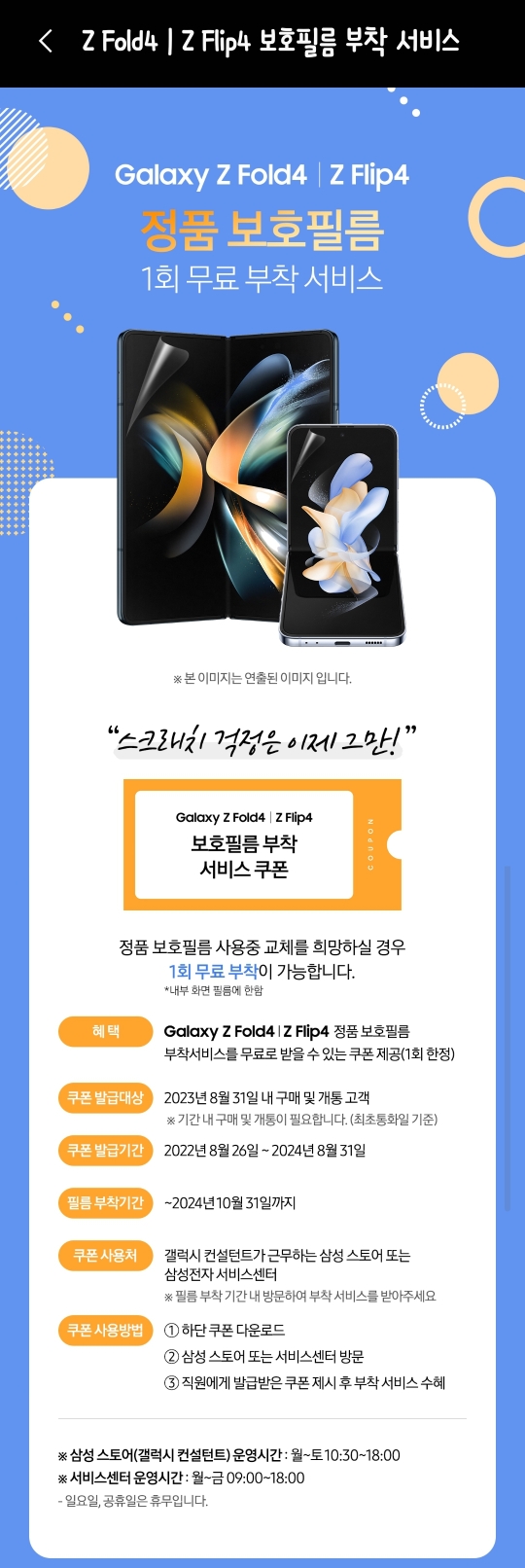 이상으로 갤럭시 Z 플립4, z폴드4 무료 액정 보호 필름 교체 방법에 관한 포스팅을 마치겠습니다.