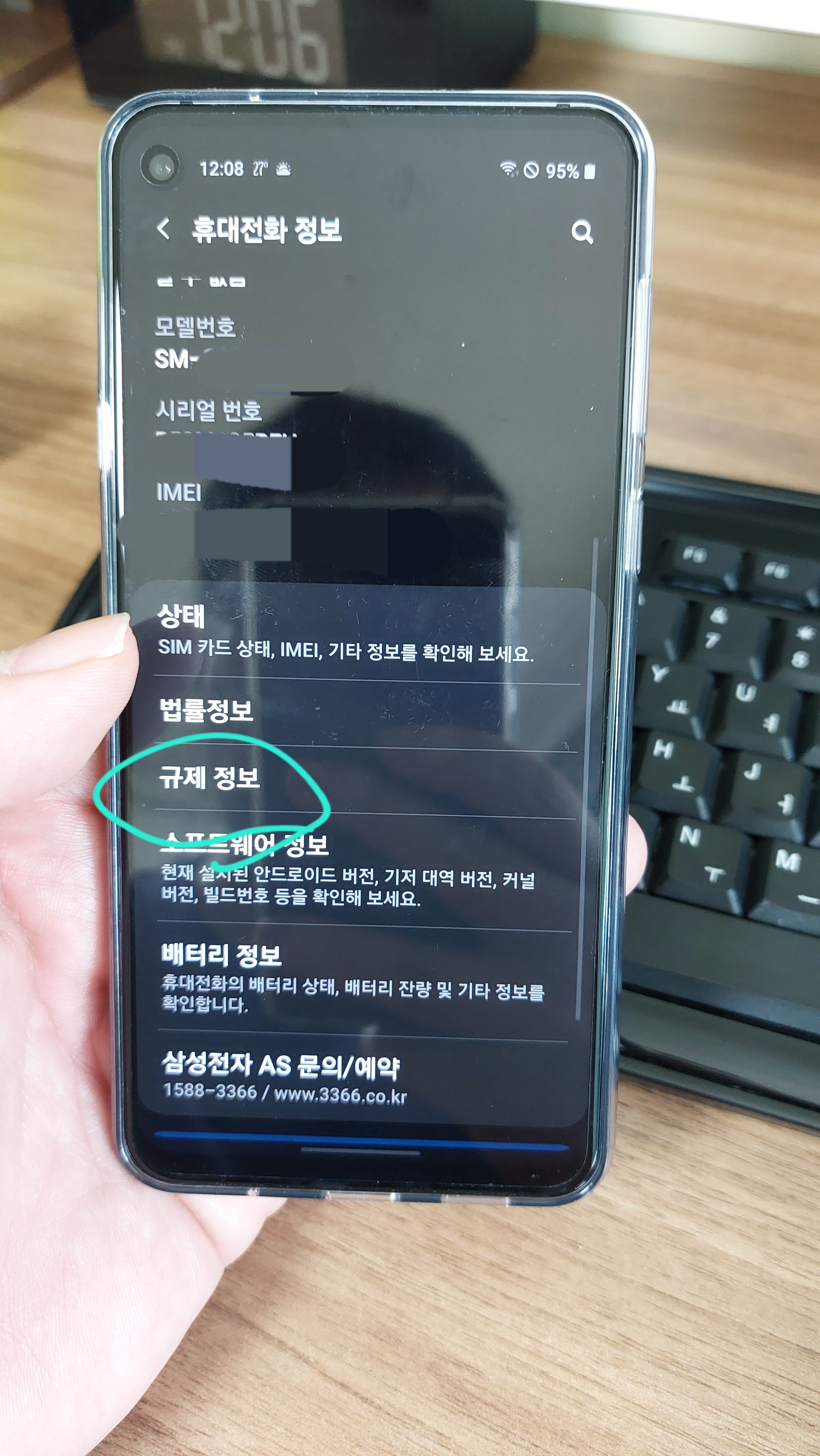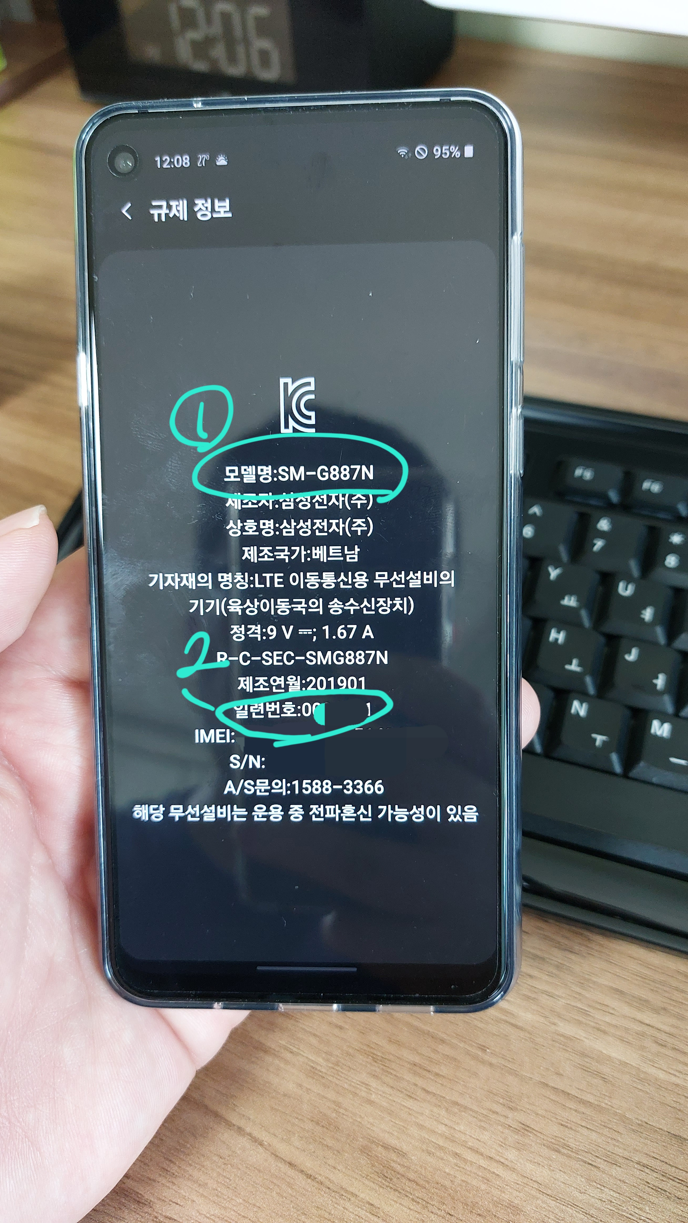 3) 규제정보 상단에모델명을 보고, 밑으로 보면, 일련번호 7자리가 보인다.