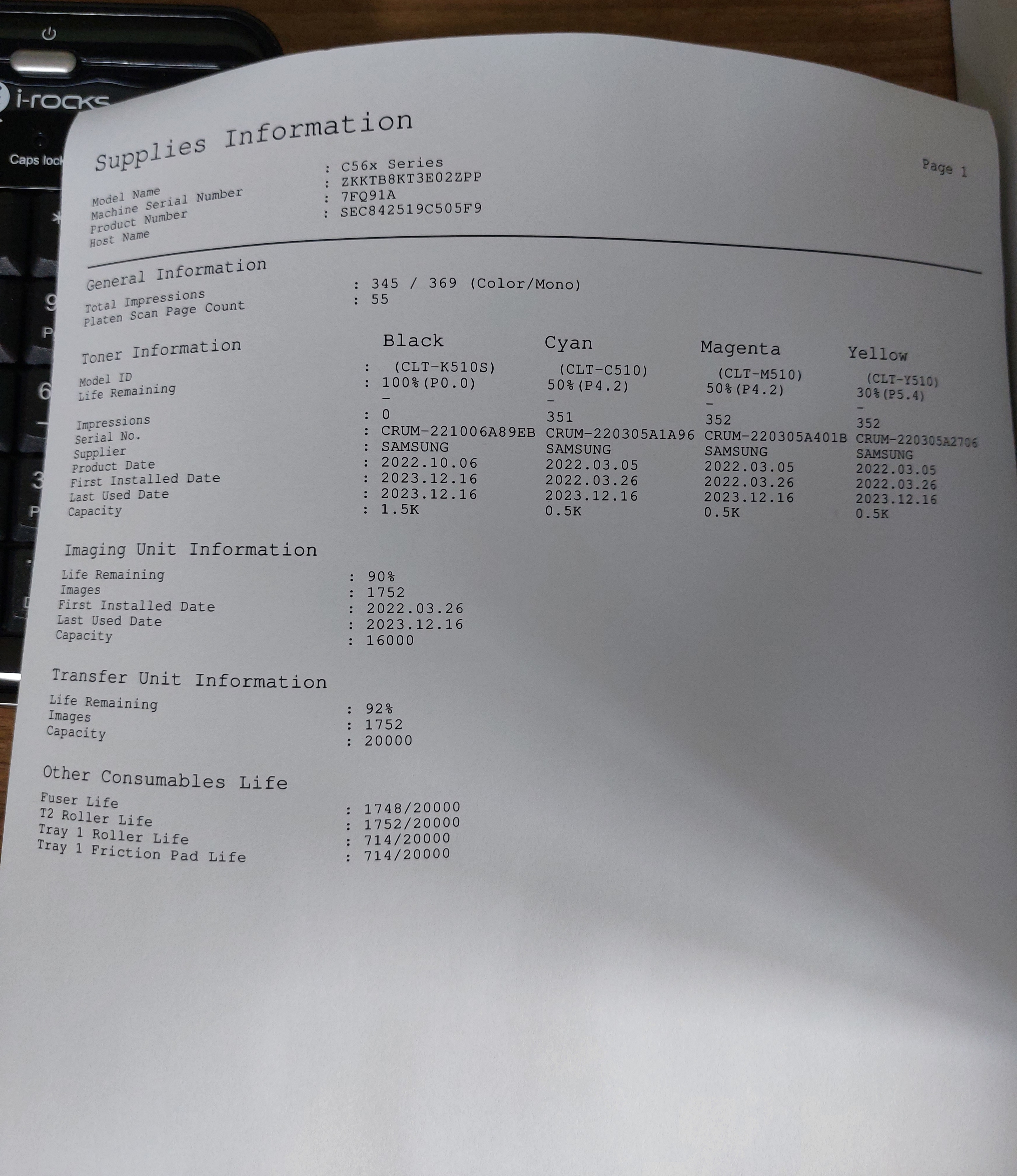 이제 토너 설치가 잘 됐는지 소모품 정보를 프린터 해 볼게요.