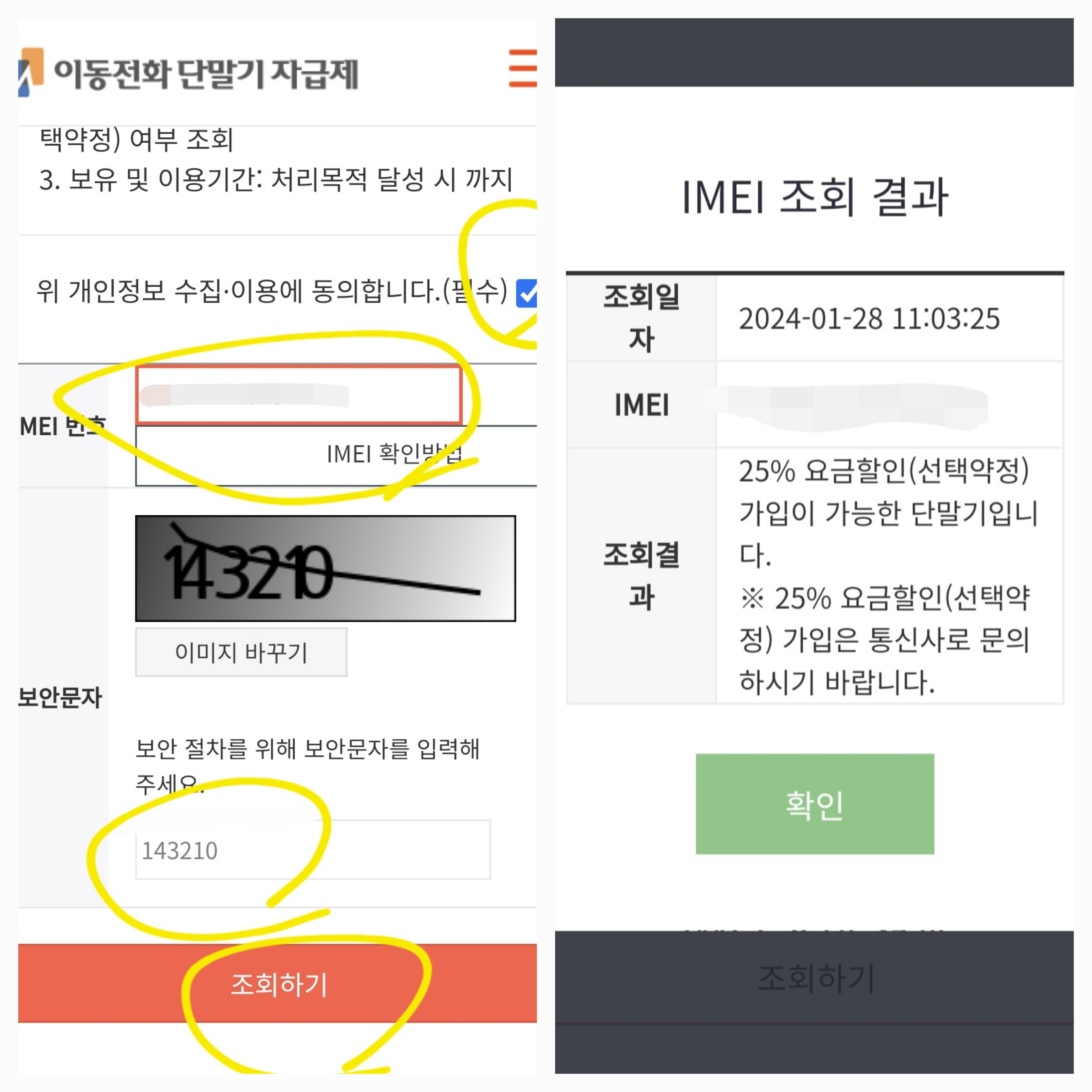 5. 맨아래 보면, 개인정보 동의체크, imei번호, 보안문자 입력후 조회 선택