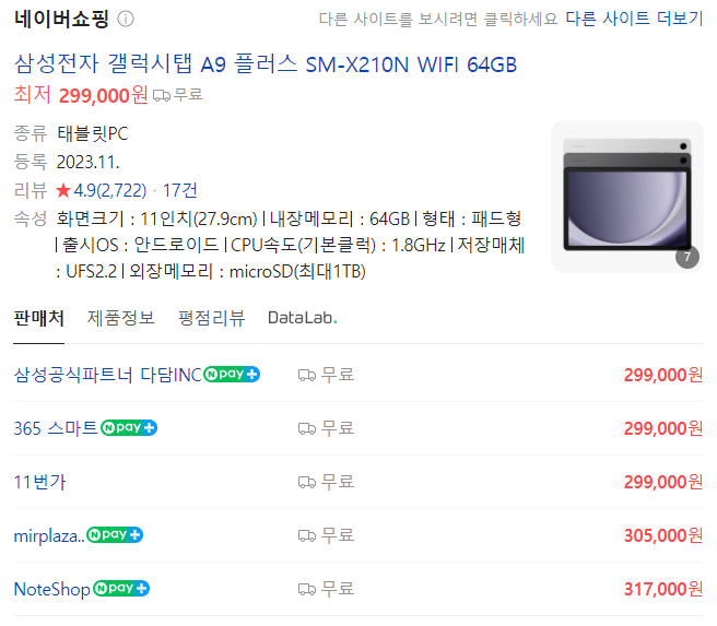 지금 네이버 쇼핑으로 갤럭시탭a9+ 최저가를 살펴보니,