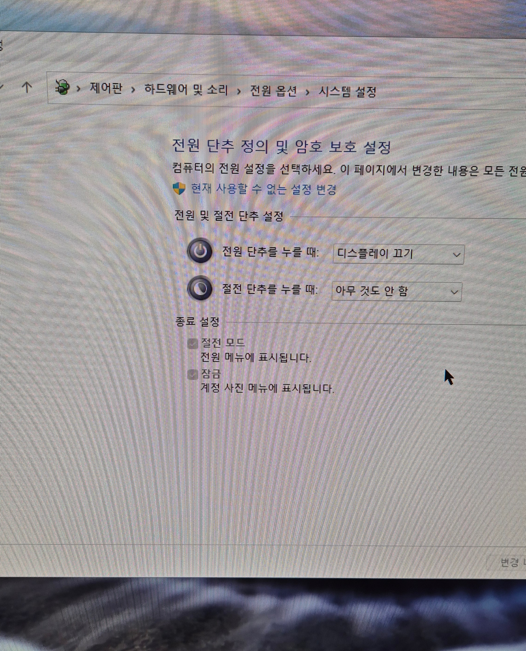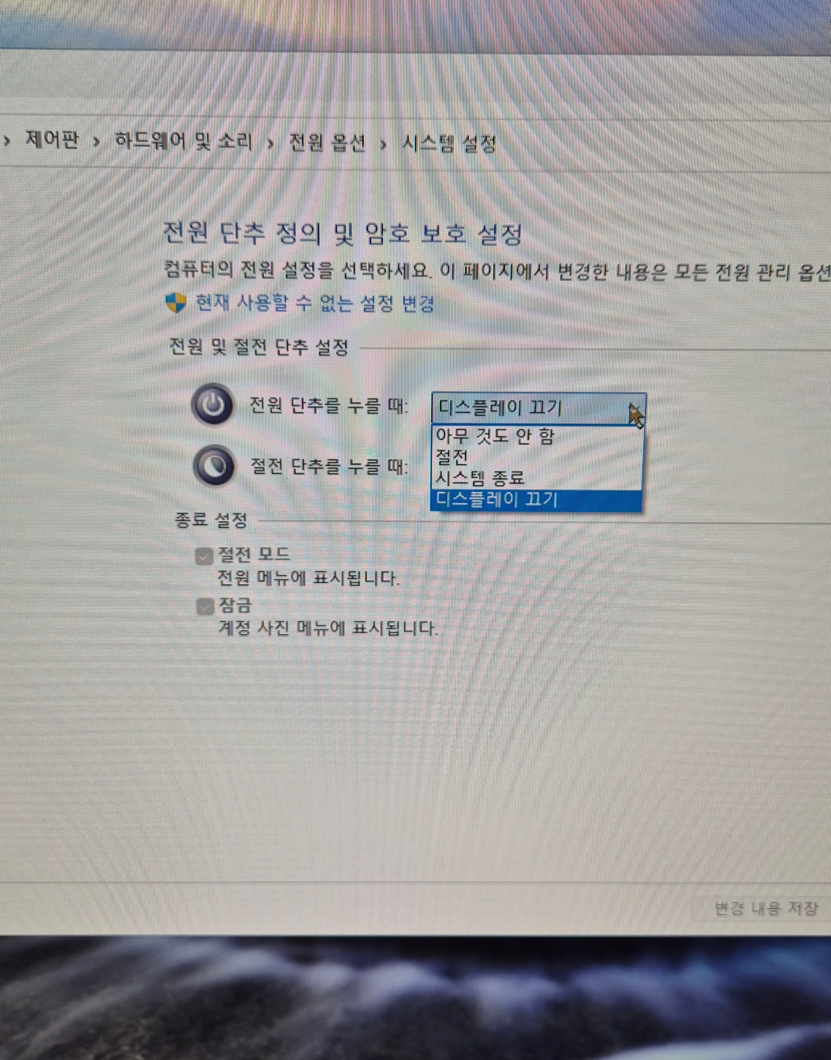저는 전원 단추 누를 때 디스플레이 끄기를 선택했고