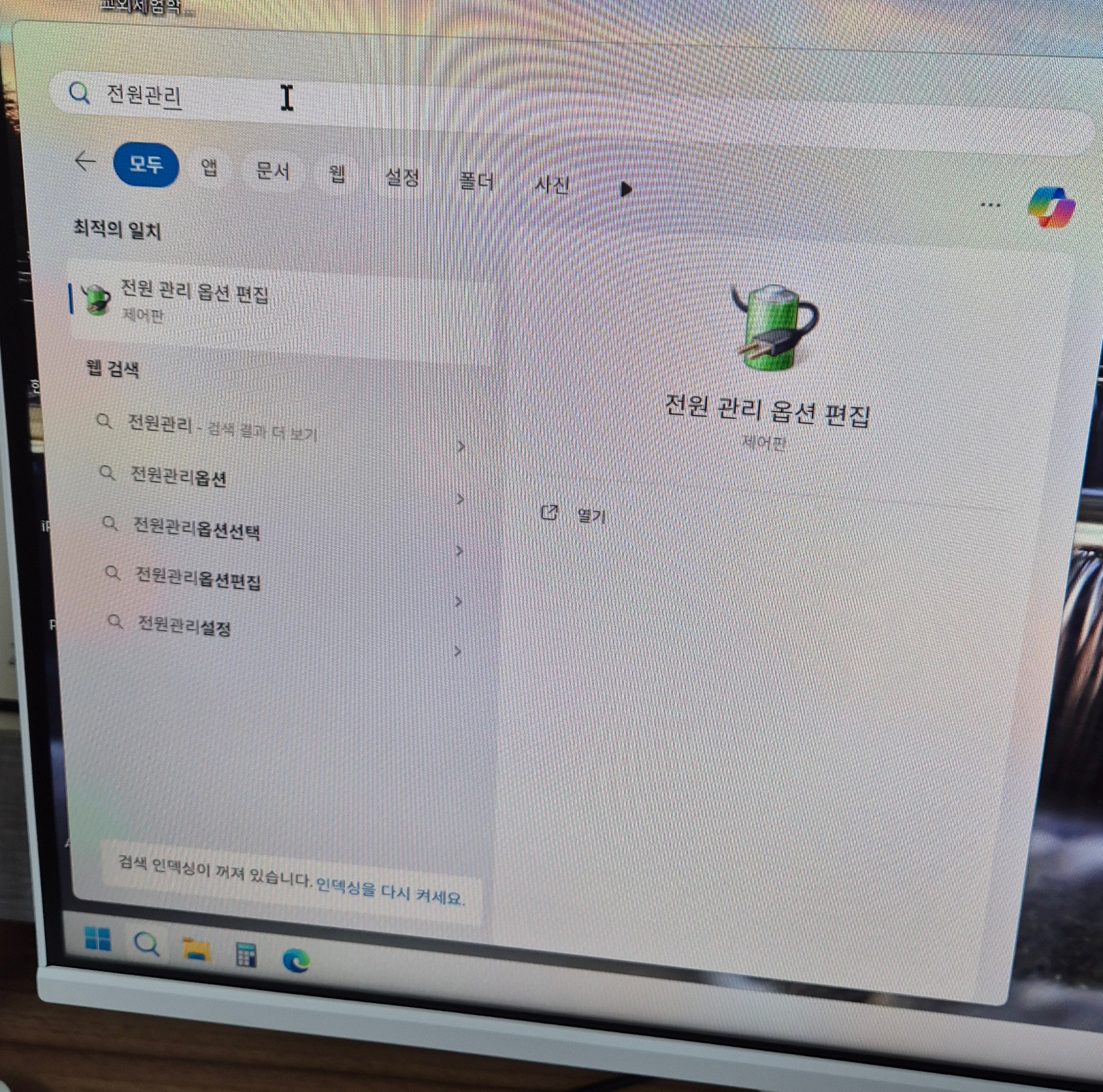 2. 그 검색창에 "전원관리" 라고 치시면 바로 밑에 전원 관리 옵션 편집이란 메뉴가 뜹니다. 그걸 선택해 주세요.